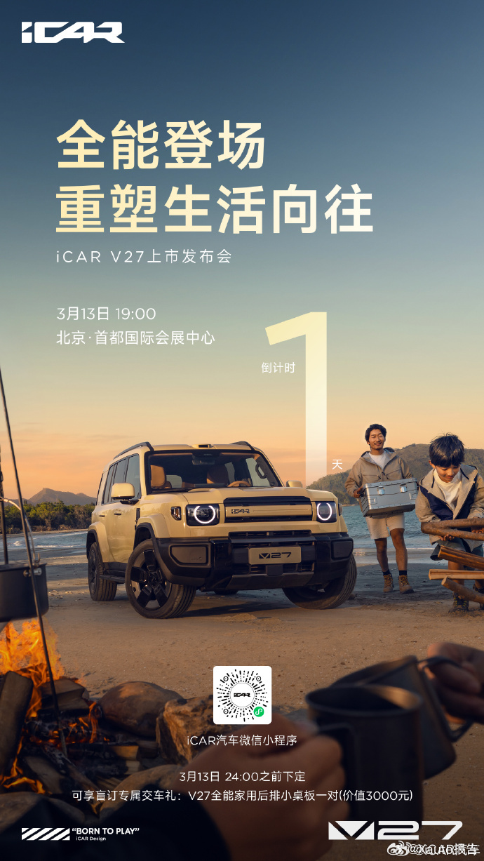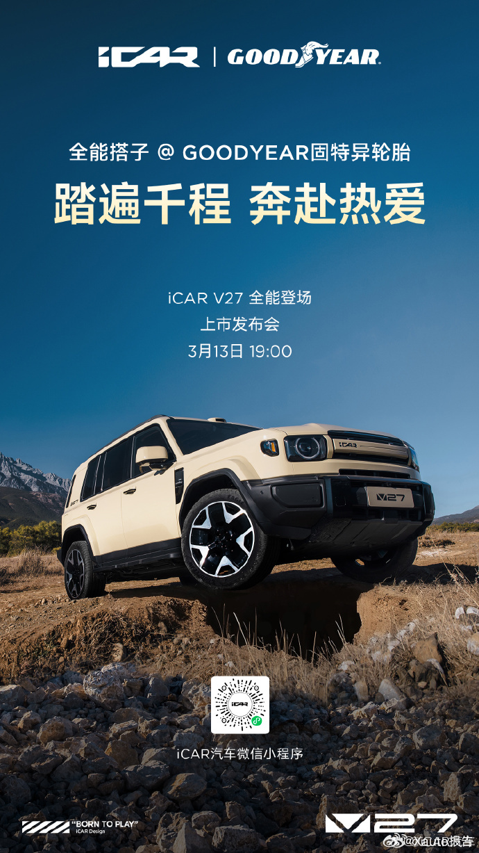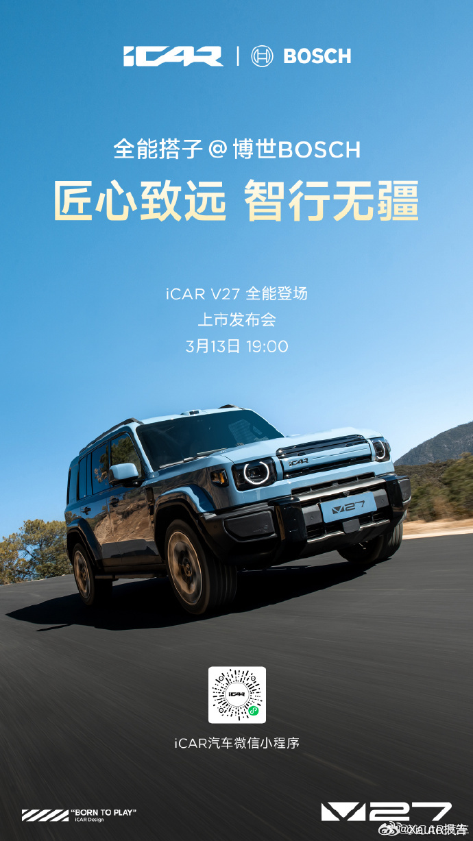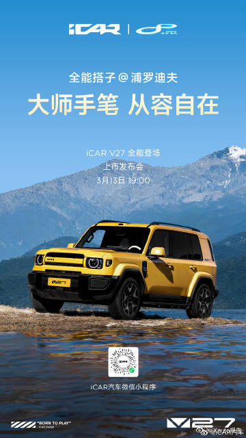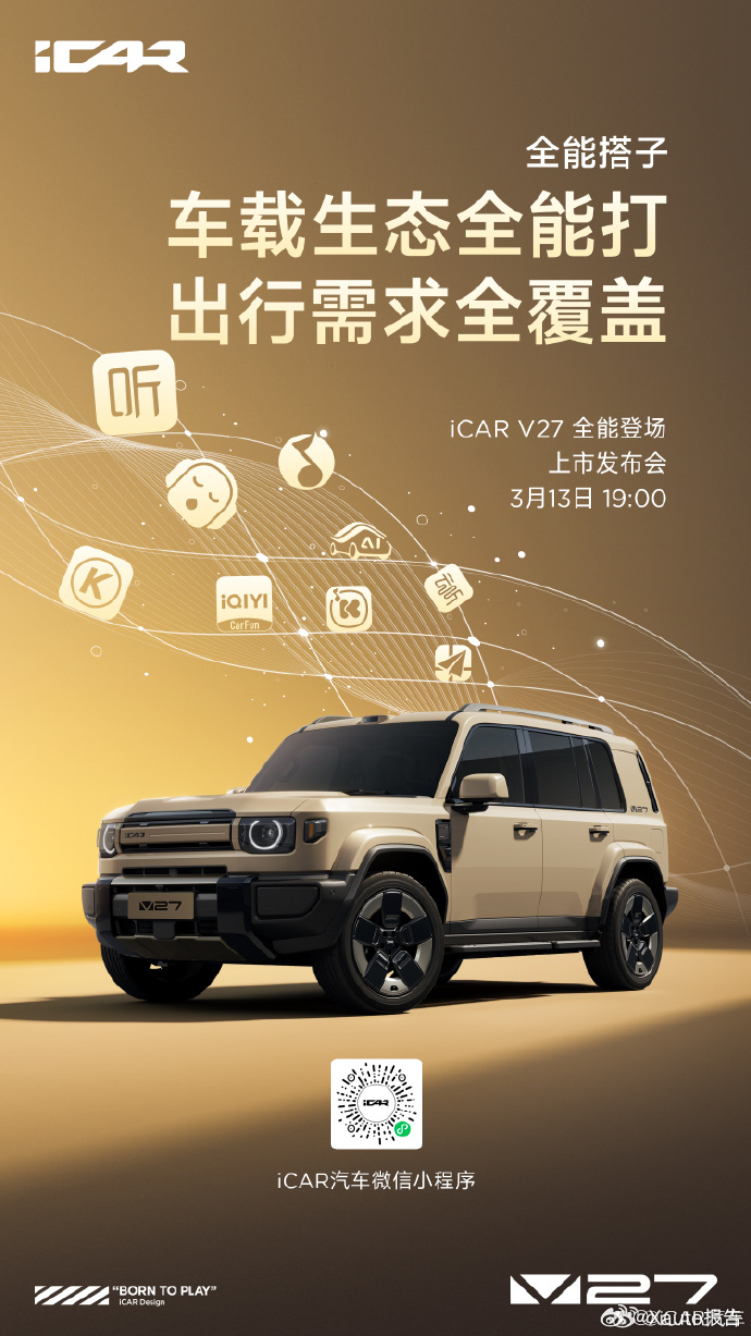 iCAR V27将于3月13日19:00上市,定位家庭新硬派SUV。该车携手多家知名零部件与影音平台打造全能配置,主打硬派进阶、智享出行。iCARV27V27全能硬派全家都爱奇瑞icarv27奇瑞