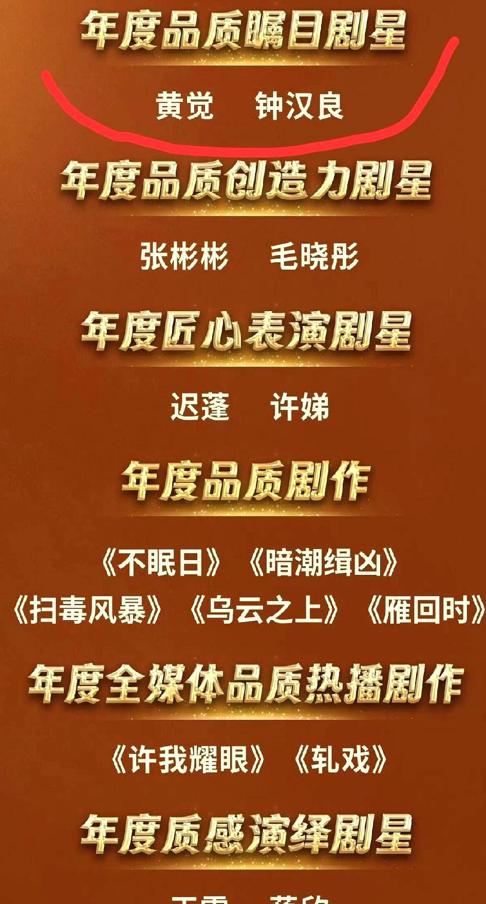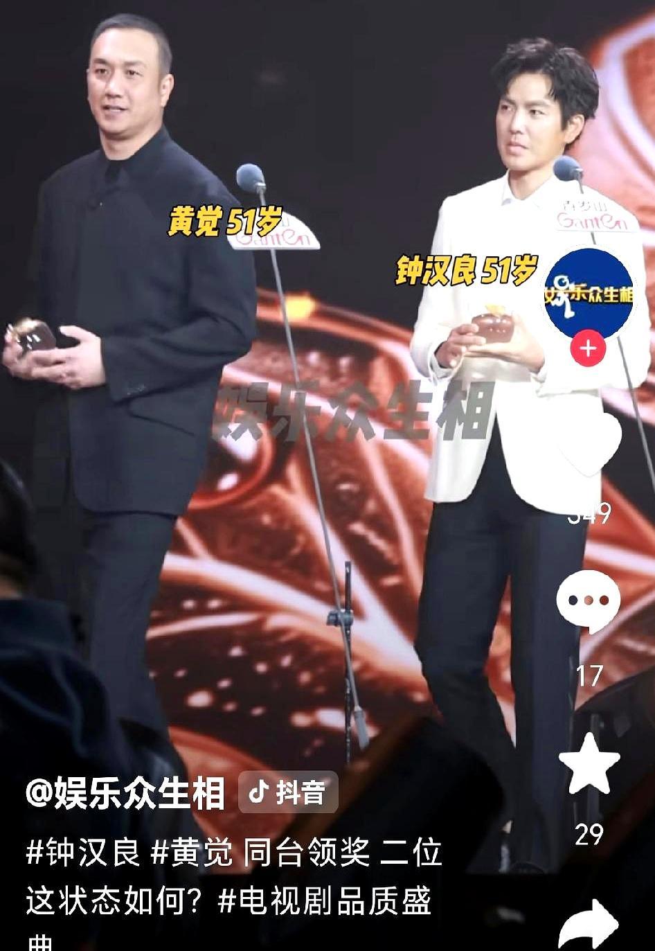 《藏海传》里的灭门仇敌,领奖台上先握手了。 黄觉演的平津侯狠辣阴鸷,当年亲手灭了钟汉良演的蒯铎满门。 俩人均是1974年生,今年51岁,这次同拿年度品质瞩目剧星。 台上俩人伸手相握的瞬间,台下媒体的快门直接响成一片。 爆剧能成现象级,从来不是只靠主角撑着,配角个个都能打。 你当年追剧的时候,是怕黄觉的反派,还是哭钟汉良的灭门戏?