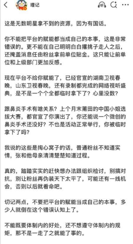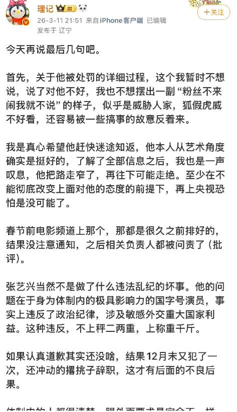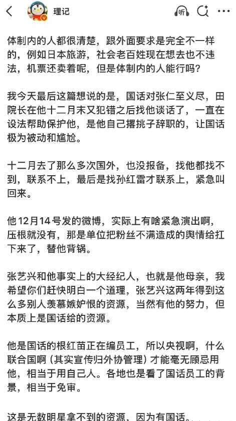 理记再度发长文硬刚警告张艺兴,直接把这事的核心扒得底朝天!他在文中明明白白点透:张艺兴这次踩的坑,根本不是违法乱纪的刑事问题,而是身为国家话剧院体制内人员,擅自出国活动不报备,触碰了政治纪律红线!这种错,没被揪住可能风平浪静,可一旦被盯上揪住了,就是能断送口碑和前路的大错!谁懂啊,原本以为是娱乐圈的普通八卦,没想到直接触碰到了体制内的规矩红线,这瓜的分量,一下子就不一样了。 可能很多粉丝还在辩解 “不就是出个国没报备吗,至于上纲上线?”,可但凡在体制内、事业单位待过的人都知道,这根本不是小事!就拿最普通的国企、基层事业单位来说,别说跨国出境,就连出市、出省都要提前跟单位报备,写明去向、往返时间、事由,更别说国家话剧院这种文旅部直属的国家级文艺单位,对在编人员的出境管理,更是有严格到极致的规章制度。擅自出境不报备,还失联到单位联系不上人,这已经不是 “马虎疏忽” 能解释的,是实打实的违反纪律,往重了说,就是无视组织规矩,换做任何一个普通体制内人员,都要面临严肃的追责处理,明星又凭什么搞特殊? 更让人看不懂的是,这事本来有回头的余地。按理记的说法,最开始如果张艺兴态度摆正,真诚道歉认错,这事大概率就能小事化了,翻篇过去。可他不仅没摆正态度,在被单位谈话提醒后,居然又犯了一次同样的错,甚至最后直接冲动提了辞职,硬生生把小事闹大,落到了现在演出被停、个人被调查的局面。 很多人可能觉得 “大不了辞职不干了,还能怎么样?”,可这想法真的太天真了,体制内的纪律问题,从来不是你辞职就能一笔勾销的。你在职期间违反的规章制度、触碰的红线,不会因为你离职就清零,该调查的还是要调查,该追责的还是要追责。就像你在公司上班期间,犯了给公司造成重大损失的错误,哪怕你当天提了离职,公司该追责、该索赔的,一样不会少,更何况是这种涉及政治纪律的问题,根本不是 “辞职跑路” 就能解决的。 而整件事里最让人唏嘘的细节,莫过于 12 月份的失联风波。当时张艺兴多次出国,国话这边翻来覆去联系不上他本人,最后还是同为国话演员、和他关系铁到不行的孙红雷,才辗转联系上他人,把他叫了回来。这个细节真的太能说明问题了,单位的电话、消息不接,领导、同事联系不上,唯独孙红雷能找到人,这哪里是意外失联?分明是故意无视单位的管理,完全没把组织的规矩放在眼里。也不得不说,孙红雷对这个弟弟是真的够意思,这种关头还愿意出面帮他兜底,俩人的兄弟情是真的没话说,可朋友能帮你一时,帮不了你一世,自己犯的错,终究还是要自己扛。 很多人觉得理记这是盯着张艺兴不放,要毁了他,可看完他的长文就会发现,与其说他是爆料,不如说他是在拉张艺兴一把。全文从头到尾都在警告他,赶紧回单位诚恳道歉认错,别把平台给你的赋能,当成了自己的真本事,你享受了体制内身份带来的红利,就要守好体制内的规矩。这话真的说到点子上了,现在太多娱乐圈的艺人,挤破头也要考编,争着抢着要体制内的身份,图的是什么?不就是图这个身份带来的 “根正苗红” 的背书,图接主旋律资源、上央视舞台的 buff,图这份编制带来的路人盘和安全感吗?可太多人只想着占编制的好处,却压根不想承担编制对应的义务和规矩,端起碗来吃红利,放下碗就无视规矩,这不就是典型的双标吗?大众反感的从来不是艺人考编,而是你占了普通人挤破头都拿不到的稀缺名额,却连最基本的规矩都不愿意遵守,凭什么? 更耐人寻味的是整件事的舆论走向,理记能把事情的前因后果、时间线、细节都扒得这么清楚,大概率是拿到了实打实的一手信息。更关键的是,他敢在张艺兴工作室发布辟谣声明之后,依旧连名带姓地追加爆料,甚至把核心问题点得明明白白,这就说明他手里绝对有证据、有底气,根本不怕张艺兴方起诉维权。毕竟在娱乐圈,造谣诽谤是要吃官司的,没有实锤的话,没人敢这么硬刚顶流艺人。反观张艺兴这边,工作室只在最开始发了一次辟谣声明,之后理记两次追加爆料,把细节越扒越细,张艺兴这边却再也没有任何正面回应,既没有发律师函,也没有拿出证据反驳,这种沉默,反而让更多网友觉得,这事恐怕不是空穴来风。 看到这里,是不是很多人都跟我一样觉得可惜?明明手握顶流的流量,还有国家话剧院的金字招牌,一手好牌,偏偏因为无视规矩、拎不清轻重,打成了现在这个样子。其实不管是明星艺人,还是我们普通人,活在这个社会上,都要守好自己该守的规矩,你享受了多少红利,就要承担多少责任,平台给你的光环,从来不是你肆意妄为的资本。现在事情还没尘埃落定,最终结果如何,全看张艺兴接下来的选择,是诚恳认错承担责任,还是继续沉默下去,我们也只能等着看后续了。