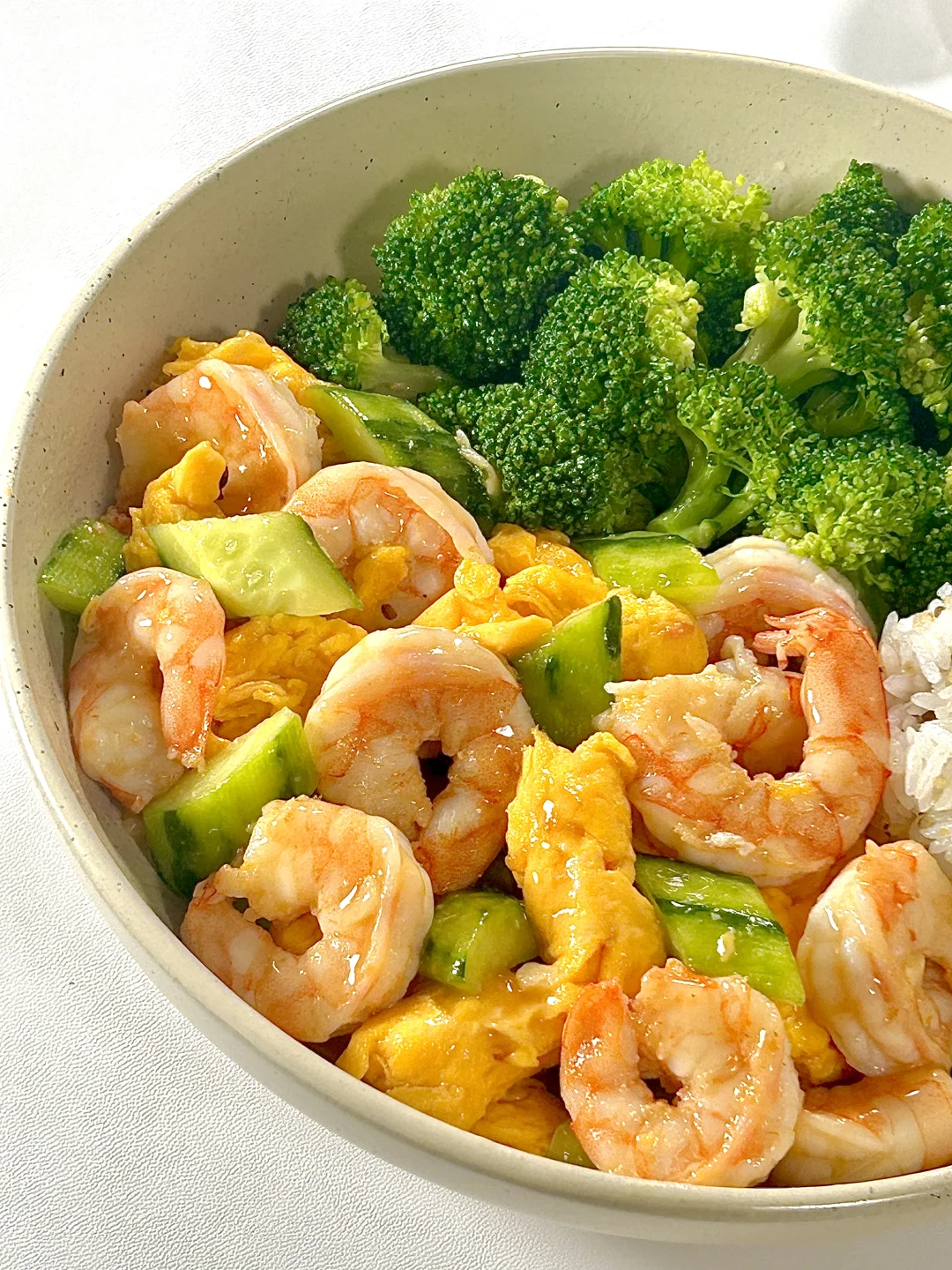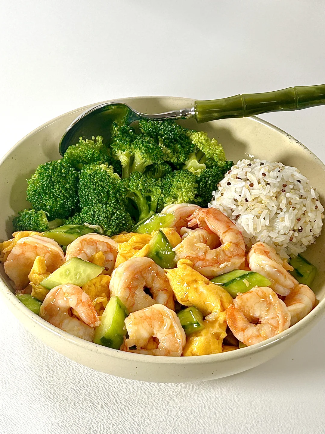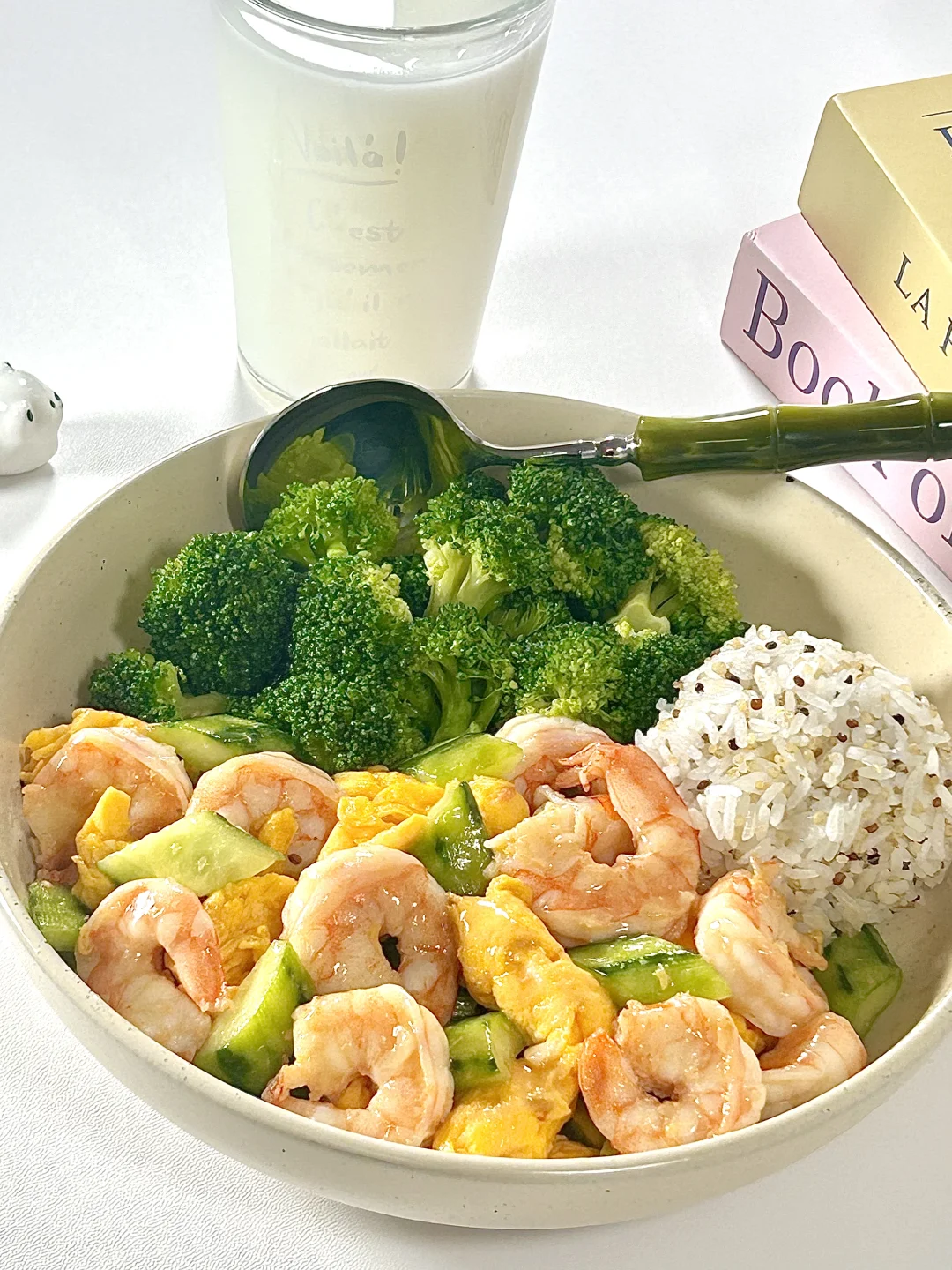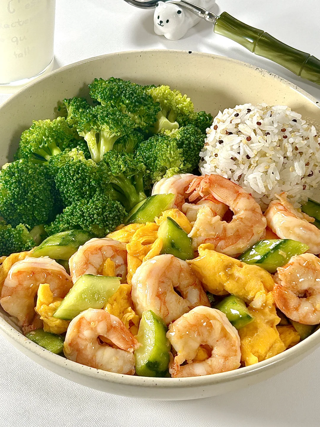 今日减脂餐虾仁炒黄瓜:巨鲜美😋 📝食材:虾仁 +黄瓜 +鸡蛋 +西兰花 +藜麦饭 ✨做法: 1️⃣虾仁加葱姜 胡椒粉 少许盐腌制10分钟 2️⃣起锅两个鸡蛋炒熟备用 3️⃣锅里喷油虾仁炒熟→加蒜末→加黄瓜→鸡蛋炒匀 最后放鸡精盐调味→加淀粉水勾芡 4️⃣锅里放适量水煮开倒入西兰花焯水2分钟 🍃装盘即可开吃啦[色色R]