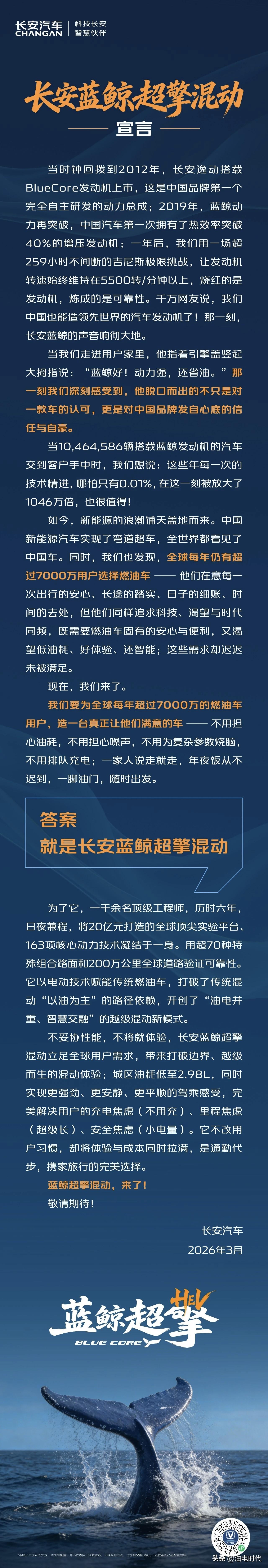 长安蓝鲸超擎混动终于要来了 没记错的话,在去年四季度就已经申报新HEV车型,包括UNI-V、CS75、CS55、逸动等热门车型。 在“宣言”中回顾了长安蓝鲸14年时间,累计1046万辆车搭载的辉煌成就。同时也官宣了城区油耗低至2.98L/100km的实力。 如果按照8元/L 汽油价格算,每公里价格降低至0.24元,油耗基本降低2/3。这对于油车爱好者来说是一个非常好的消息。 其实这一部早就该来的,以往消费者对于国产燃油车的印象之一就是油耗高,认为油混就只有丰田等日系才能达到,那么现在希望大家将目光聚焦到中国品牌车型上来。