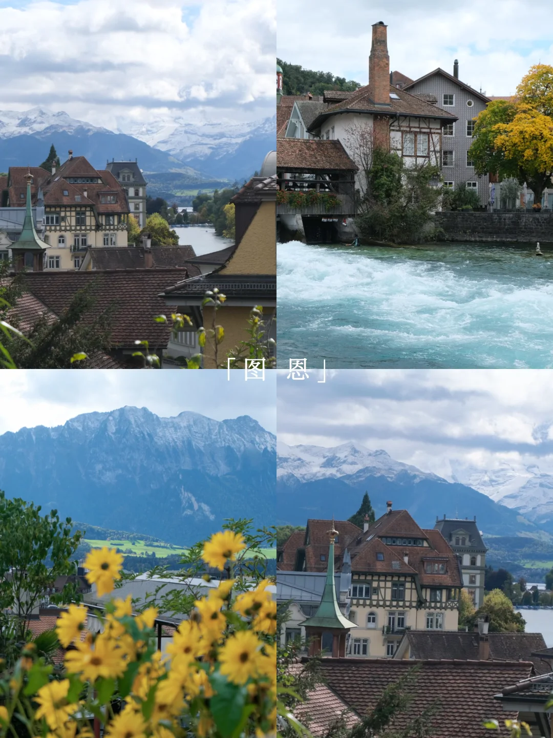 🏰图恩:到访的第一个小镇,阴天都很美,小镇被一条河流穿过,可以看到雪山、城堡,沿河走能一直走到图恩湖边!超美