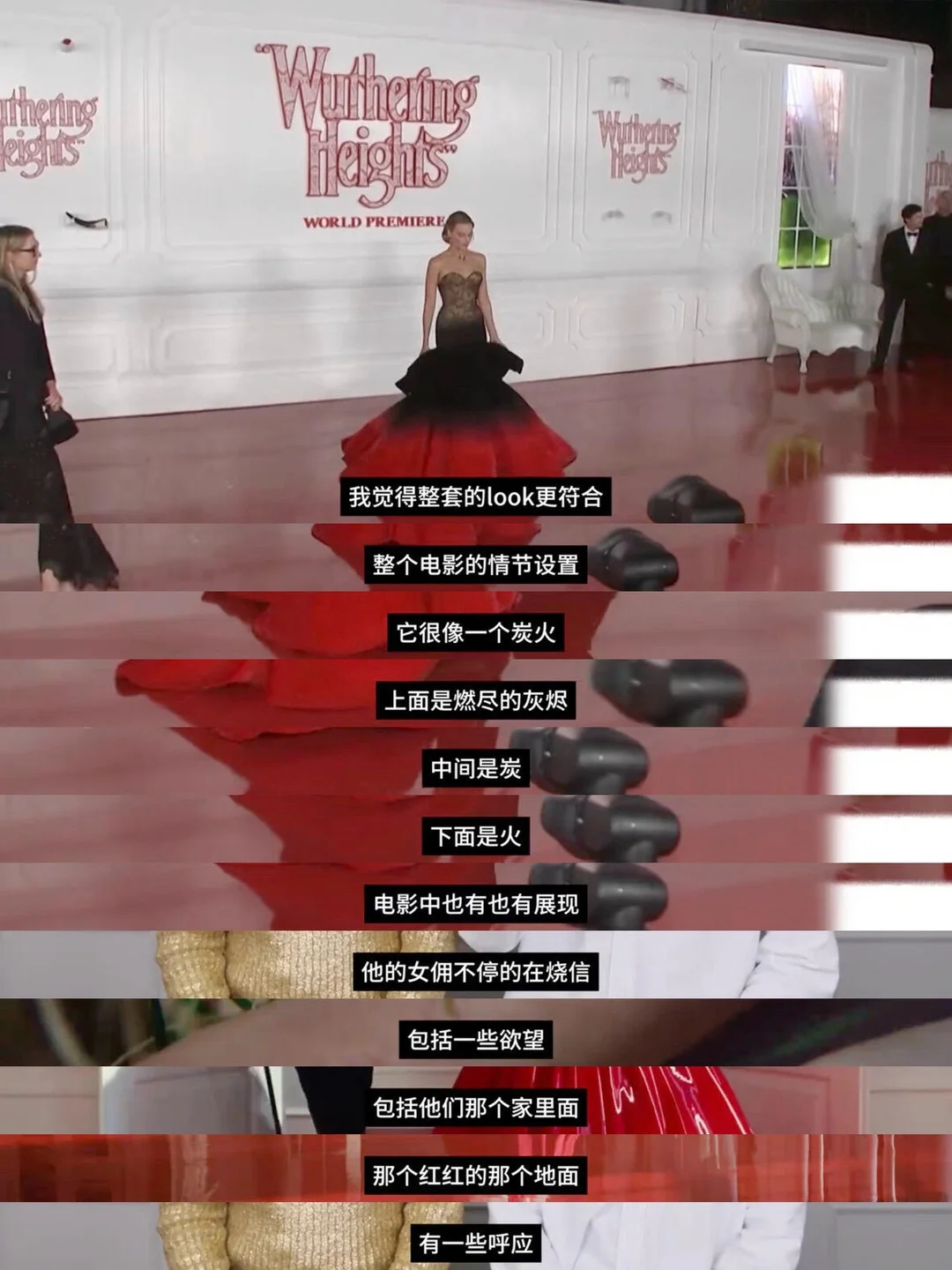 🏷️在洛杉矶首映礼上,她身穿Schiaparelli的紧身胸衣礼服,巨大的裙摆由红到黑渐变,直接揭示了“爱到毁灭”的主题。