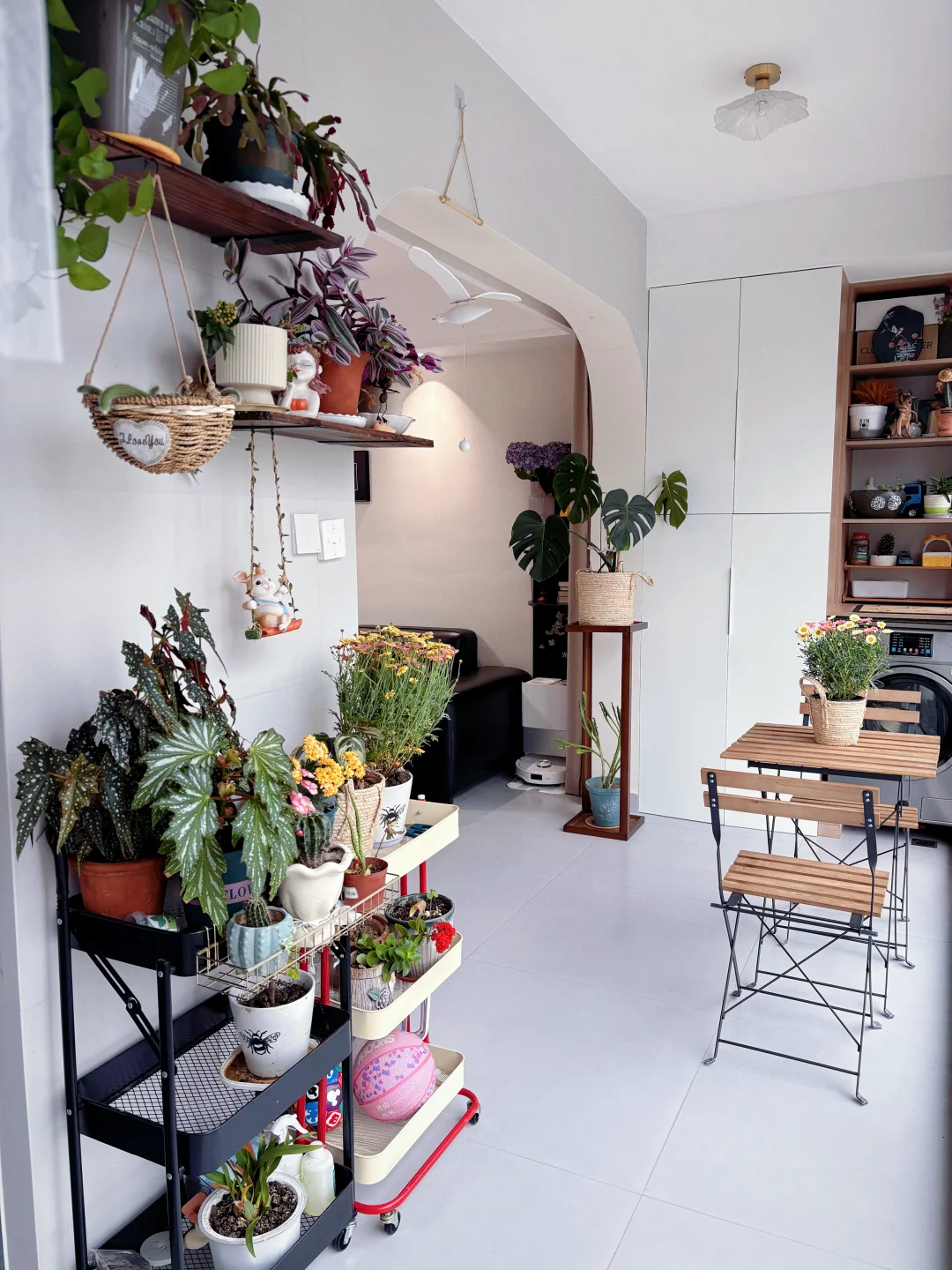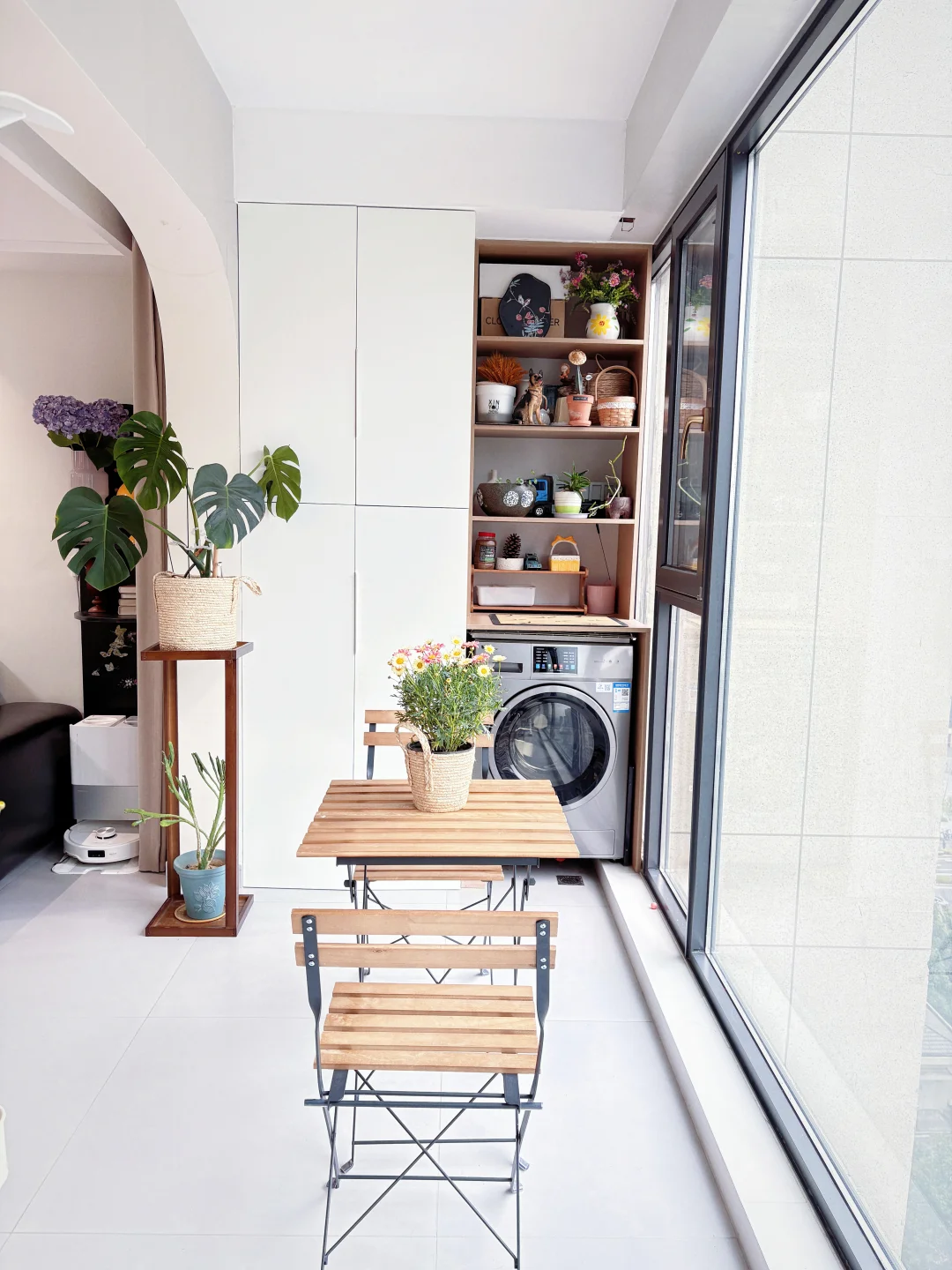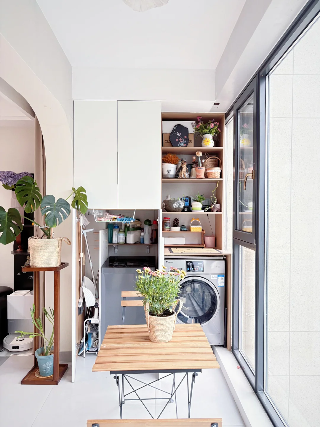 三花架:烘干机省出来的位置做了花架,还在墙面做了置物架,收纳足够。