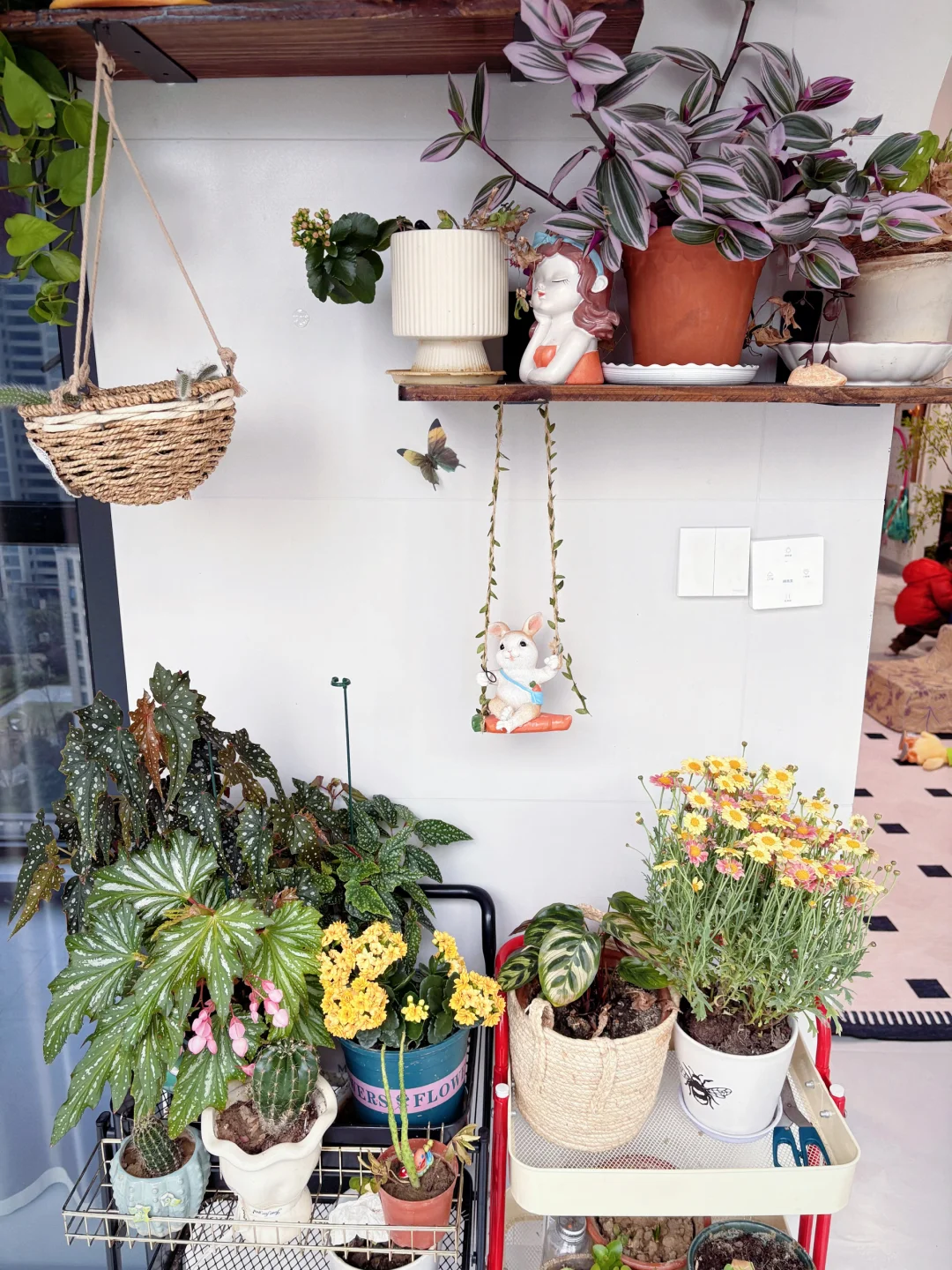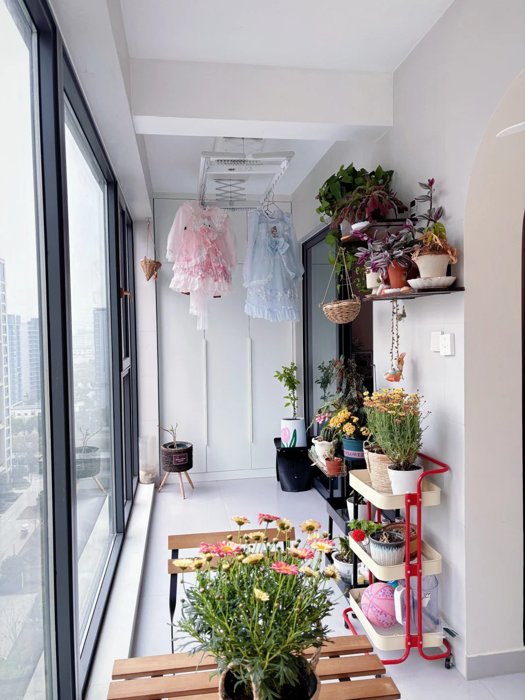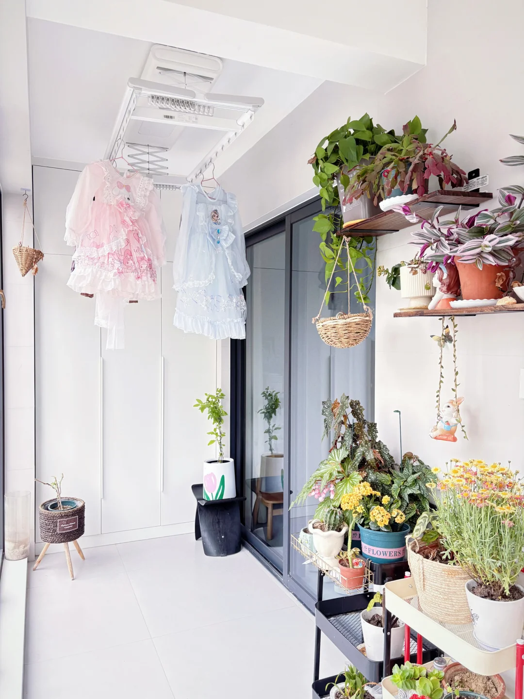 三花架:烘干机省出来的位置做了花架,还在墙面做了置物架,收纳足够。