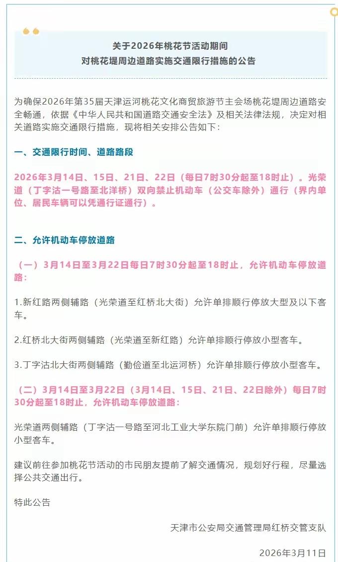 准备好,与桃花撞个满怀吧!就在本周六(3月14日)。2026天津运河桃花节将于14日盛大启幕。届时,经过修整的桃花堤也将重新开放。目前,桃花花蕾已缀满枝头,性子急的早已迫不及待地绽放了笑脸,快约好你的拍照搭子,来桃花堤拍美照吧!注意!入口设在勤俭桥那里,北洋桥这边是出口。天津 热点 2026运河桃花节 天津桃花堤14日重新开放 快来桃花堤赏花吧 天津的春天来了