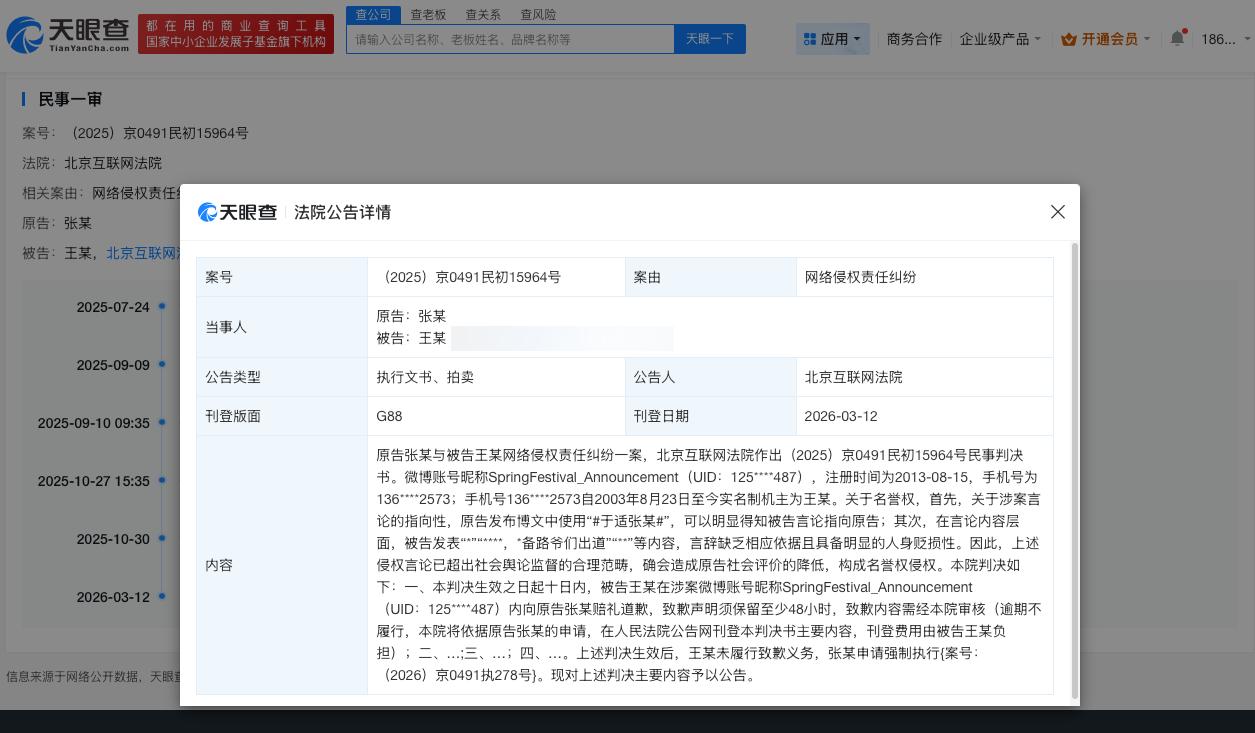 造谣于适张雨绮方未道歉被公告 张雨绮网络维权胜诉 天眼查天眼风险信息显示,近日,北京互联网法院公告张雨绮与王某网络侵权责任纠纷一案民事判决书。法院认定博文中涉及“于适张雨绮”,被告王某在微博发表针对张雨绮的贬损性言论构成名誉权侵权,判决王某在涉案微博账号内向张雨绮赔礼道歉。因王某未履行致歉义务,张雨绮申请强制执行。 天眼查信息: