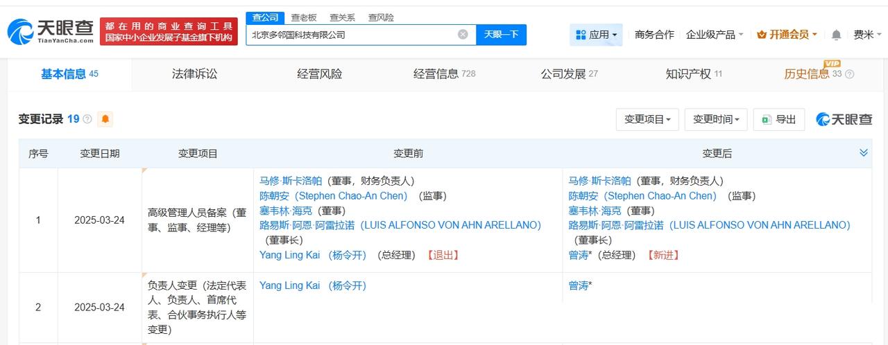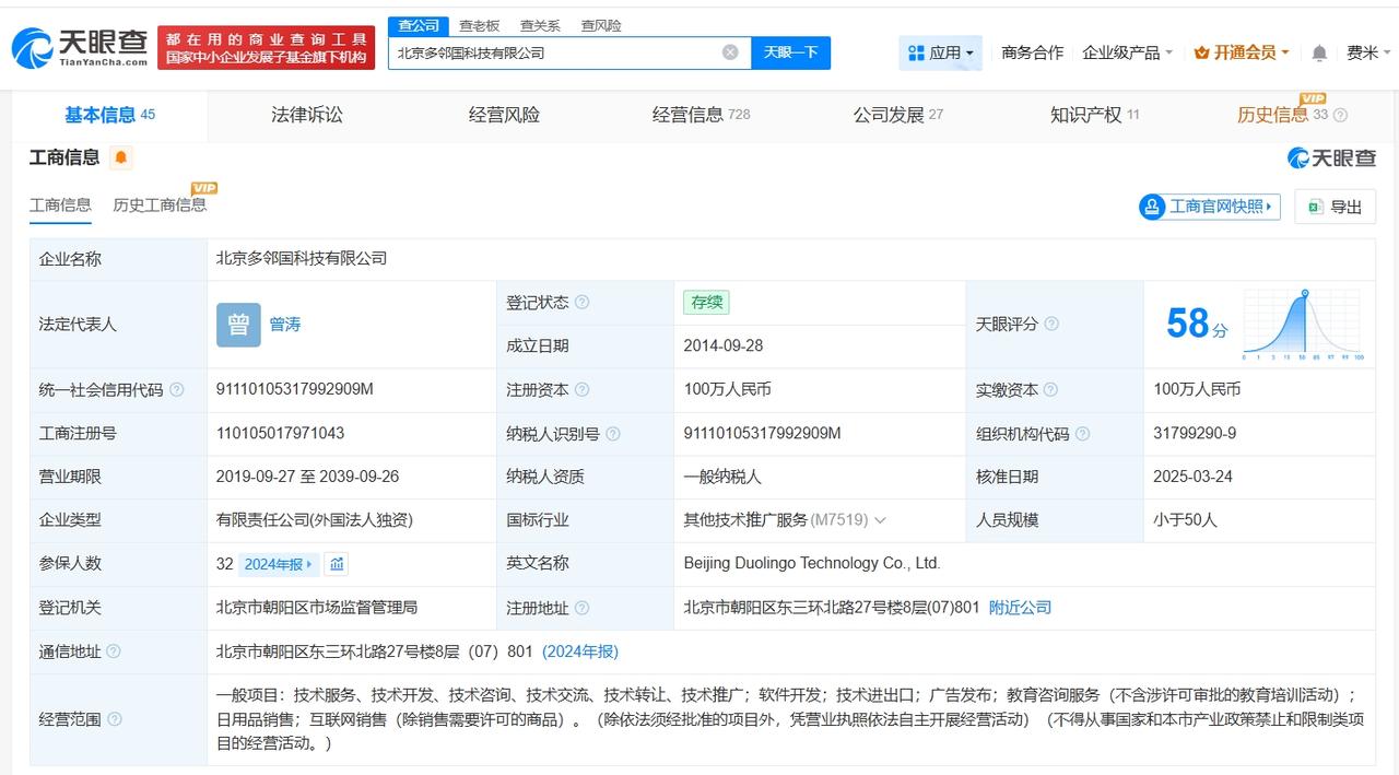揭秘多邻国中国公司 多邻国中国公司去年发生高管变更多邻国绿鸟 离职 近日,多邻国官方以吉祥物“多儿”名义发布辞职信,相关话题引发热议。 天眼查App显示,多邻国中国关联公司北京多邻国科技有限公司成立于2014年9月,注册资本100万人民币,经营范围包括软件开发、技术进出口、广告发布等。股东信息显示,该公司由Duolingo, Inc.全资持股。变更记录显示,去年3月,Yang Ling Kai (杨令开)卸任该公司法定代表人,由曾涛接任。 天眼查信息: