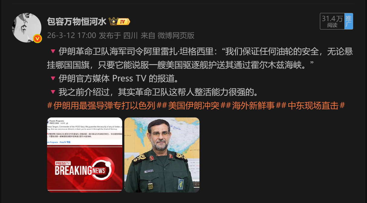🔻你现在再想想伊朗革命卫队海军司令阿里雷扎·坦格西里的这句话:“我们保证任何油轮的安全,无论悬挂哪国国旗,只要它能说服一艘美国驱逐舰护送其通过霍尔木兹海峡。”🔻死亡不过是在凉爽的夏夜安眠,革命卫队年轻的中小登渴望着功勋。美国海军已逃离伊朗周边海域伊朗空军指挥官遭袭身亡海外新鲜事中东现场直击