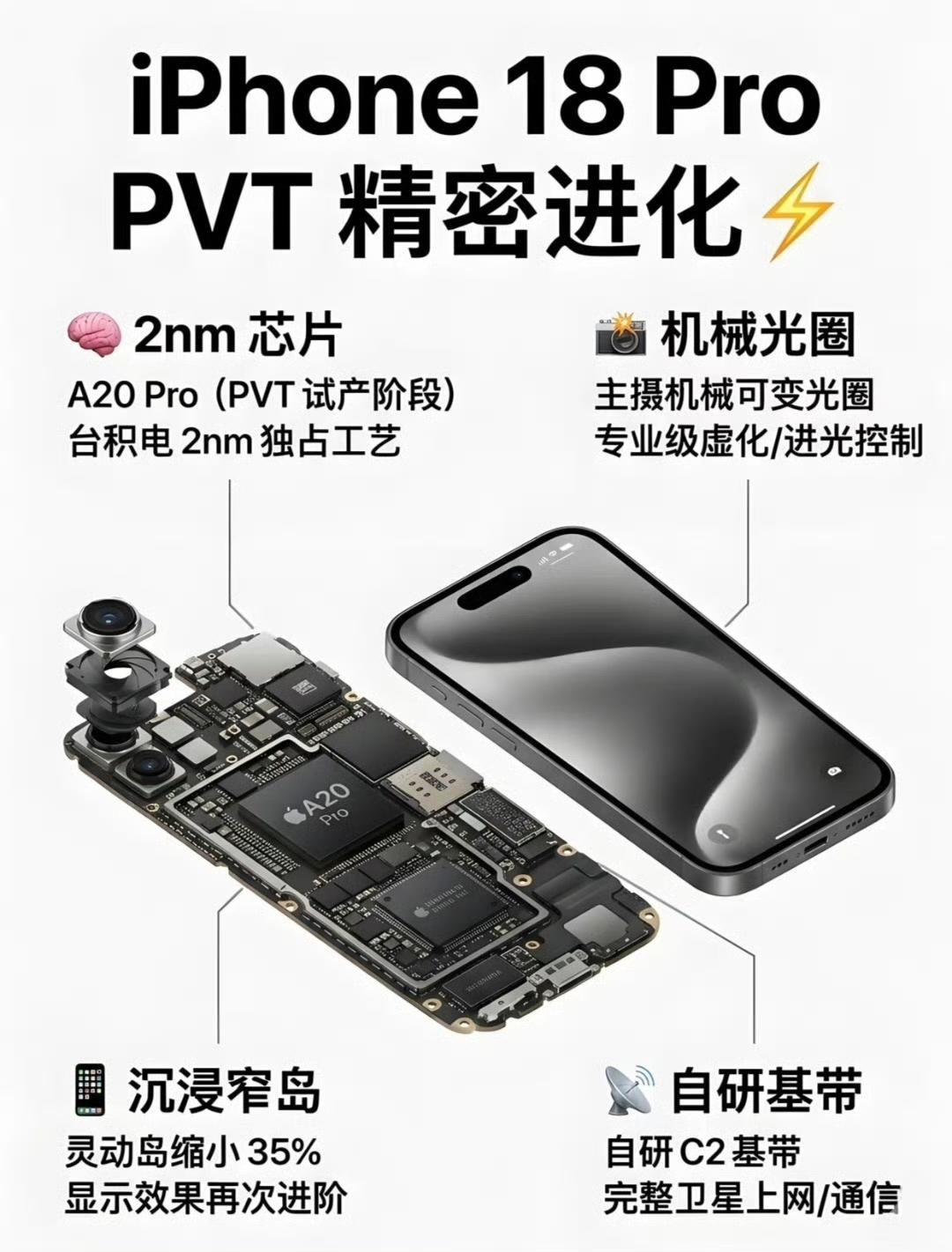 关于iPhone18Pro几个好消息和坏消息 最大的好消息是,在安卓机因为内存条、芯片涨价而不约而同还要涨幅300-600时,iPhone18系列的售价不会改变! 其次,这次的配色挺新颖的,可能为了迎合女性用户市场,iPhone会考虑出樱花粉的Pro系列,之前iPhone标准版粉色销量不差的,可惜高配版没有少女色 另外升级也是比较可观的: 1、屏幕峰值亮度升级为3200nit,会比17PM更亮; 2、采用A20 Pro处理器,台积电2nm工艺,性能+10~15%,功耗-25~30%; 3、依旧是12GB内存; 4、苹果自研C2 5G基带 5、升级4800万像素主摄为可变光圈,苹果史上独一档; 6、由于安卓卷续航用户反响好,🔋Pro≈4800mAh电池,Pro Max≈5000mAh 而坏消息就是屏下Face ID要延期了,可能20周年iPhone纪念版手机的全面屏手机也要泡汤了。还有就是外观跟iPhone17PM没啥变化。 所以如果你对影像需求不是非常极致,建议在今年618直接低价入手iPhone17ProMax,没必要花费更多的时间和💰去等iPhone18Pro系列了...
