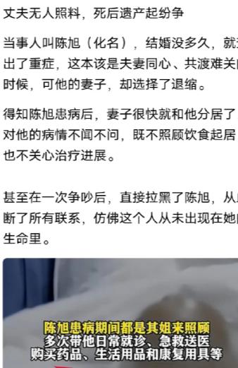 “公平吗?”北京,男子新婚不久,查出重症,妻子竟跟他分居,甚至吵架后把他拉黑,2年不闻不问,男子的姐姐知道后,上门悉心照料弟弟,求医问药,男子去世后,也是姐姐料理丧葬事宜,就在男子去世一年后,妻子突然冒出来,要求继承男子名下的房子、车子、存款等全部遗产。姐姐说什么都不同意,双方闹上法院,法院判决,妻子分得40%的遗产,却引起争议?   北京某房产交易中心,法警拦住一名女子,当场查获房产过户材料。   这名女子,正是去世男子的妻子,竟想偷偷转走丈夫名下房产。   她从未照料过病重的丈夫,却在遗产判决后,仍不死心耍小动作。   而一旁的姐姐,看着这一幕,眼里满是无奈,也藏着一丝释然。   没人知道,这场强制执行的背后,藏着多少不为人知的拉扯。   时间拉回男子去世一年后,妻子第一次找上门索要遗产。   她没提半句丈夫的后事,张口就问房子车子存款在哪里。   姐姐当场拒绝,拿出弟弟生前的看病票据,摆到她面前。   “这两年,你看过他一次吗?这些医药费,你掏过一分吗?”   妻子却不为所动,反而偷偷联系房产中介,想私下过户房产。   她以为姐姐不知道,偷偷准备材料,谎称自己是唯一继承人。   可她没想到,姐姐早已提前办理了遗产保全,断了她的歪心思。   其实,姐姐在整理弟弟遗物时,就发现了妻子的自私嘴脸。   除了那本记录绝望的日记,还有一张未寄出的离婚协议书。   日记里写着,他病重后,妻子不仅拉黑他,还偷偷转移夫妻存款。   他曾想过离婚,可身体虚弱,连签字的力气都没有,只能作罢。   姐姐看着日记和协议书,又想起弟弟当时的模样,心如刀绞。   她还记得,第一次找到弟弟时,他连喝口水都要自己挣扎着起身。   家里的水电费欠了好几个月,冰箱里只有几袋过期的方便面。   弟弟拉着她的手,声音微弱:“姐,我想活下去,我想再见她一面。”   姐姐抱着弟弟哭了,承诺一定会好好照顾他,帮他治病。   她辞掉了待遇不错的工作,把弟弟接到自己身边,方便照料。   每天天不亮就起床,给弟弟熬药、做饭,陪他做康复训练。   为了凑医药费,她卖掉了自己的首饰,还向娘家借了不少钱。   她甚至求遍了北京各大医院的医生,哪怕只有一丝希望也不放弃。   有一次,弟弟半夜突发病危,她冒着大雪,背着弟弟往医院跑。   一路上,她摔倒了好几次,却始终紧紧护着背上的弟弟。   可即便如此,弟弟的病情还是不断恶化,身体越来越虚弱。   弟弟去世前,特意留下口头遗嘱,希望把财产留给姐姐。   可惜他当时已经无力写下书面遗嘱,也没有见证人在场。   弟弟走后,姐姐按照他的意愿,好好料理了他的后事。   她给弟弟选了一块风景好的墓地,每天都去陪他说说话。   可她万万没想到,妻子得知弟弟有遗产后,会突然冒出来。   妻子不仅上门索要遗产,还在小区里撒泼打滚,败坏姐姐名声。   她逢人就说,姐姐霸占她的财产,逼着弟弟立遗嘱,十分恶毒。   不明真相的邻居议论纷纷,姐姐承受了太多不该有的指责。   为了证明自己的清白,也为了完成弟弟的心愿,姐姐提起了诉讼。   她不仅提交了日记、票据,还找到了当时照顾弟弟的护工作证。   护工当庭作证,说从未见过男子的妻子,一直是姐姐在照料。   法院还查到,妻子在男子病重期间,偷偷转移了部分夫妻存款。   证据确凿,法院最终作出判决,妻子分得40%遗产,姐姐分得60%。   判决下来后,妻子不服气,拒不执行,还想偷偷转走房产。   她以为神不知鬼不觉,却被房产交易中心的工作人员发现异常。   工作人员及时联系了法院,法警赶到现场,当场拦住了她。   看着法警拿出的强制执行文书,妻子终于慌了神,瘫坐在地上。   她哭着忏悔,说自己一时糊涂,不该贪财,不该抛弃丈夫。   可再多的忏悔,也挽回不了已经发生的一切,也换不回弟弟的生命。   如今,这场遗产纠纷,终究没有赢家,却给世人上了深刻的一课。   自私和贪婪,只会让人失去一切,而善良和付出,终会收获温暖。   夫妻之间,最重要的是患难与共,而非在对方危难时转身逃离。   法律或许会给过错者留有余地,但人心,从来不会偏袒冷漠之人。   信源:网易新闻