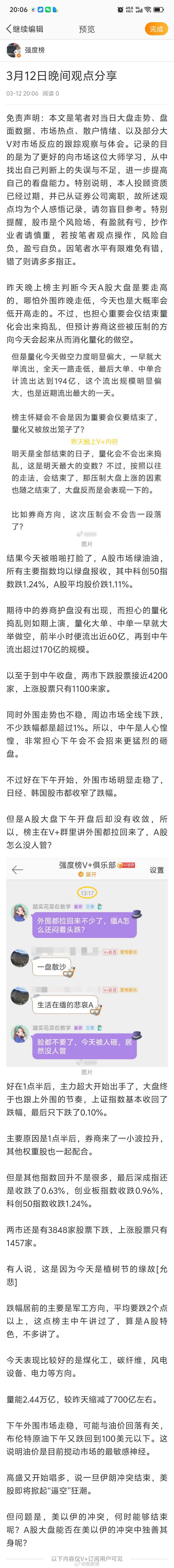 晚间分享股票A股 3月12日晚间观点分享昨天晚上榜主判断今天A股大盘是要走高的,哪怕外围昨晚走低,今天也是大概率会低开高走的。不过,也担心重要会仪结束量化会出来捣乱,但预计券商这些被压制的方向今天会起来从而消化量化的做空。结果今天被啪啪打脸了,A股市场绿油油,所有主要指数均以绿盘报收,其中科创50指数跌1.24%,A股平均股价跌1.11%。期待中的券商护盘没有出现,而担心的量化捣乱则如期上演,量化大单、中单一早就大举做空,前半小时便流出近60亿,再到中午流出超过170亿的规模。以至于到中午收盘,两市下跌股票接近4200家,上涨股票只有1100来家。同时外围走势也不稳,周边市场全线下跌,不少跌幅都是超过1%。所以,中午是人心惶惶,非常担心下午会不会招来更猛烈的砸盘。