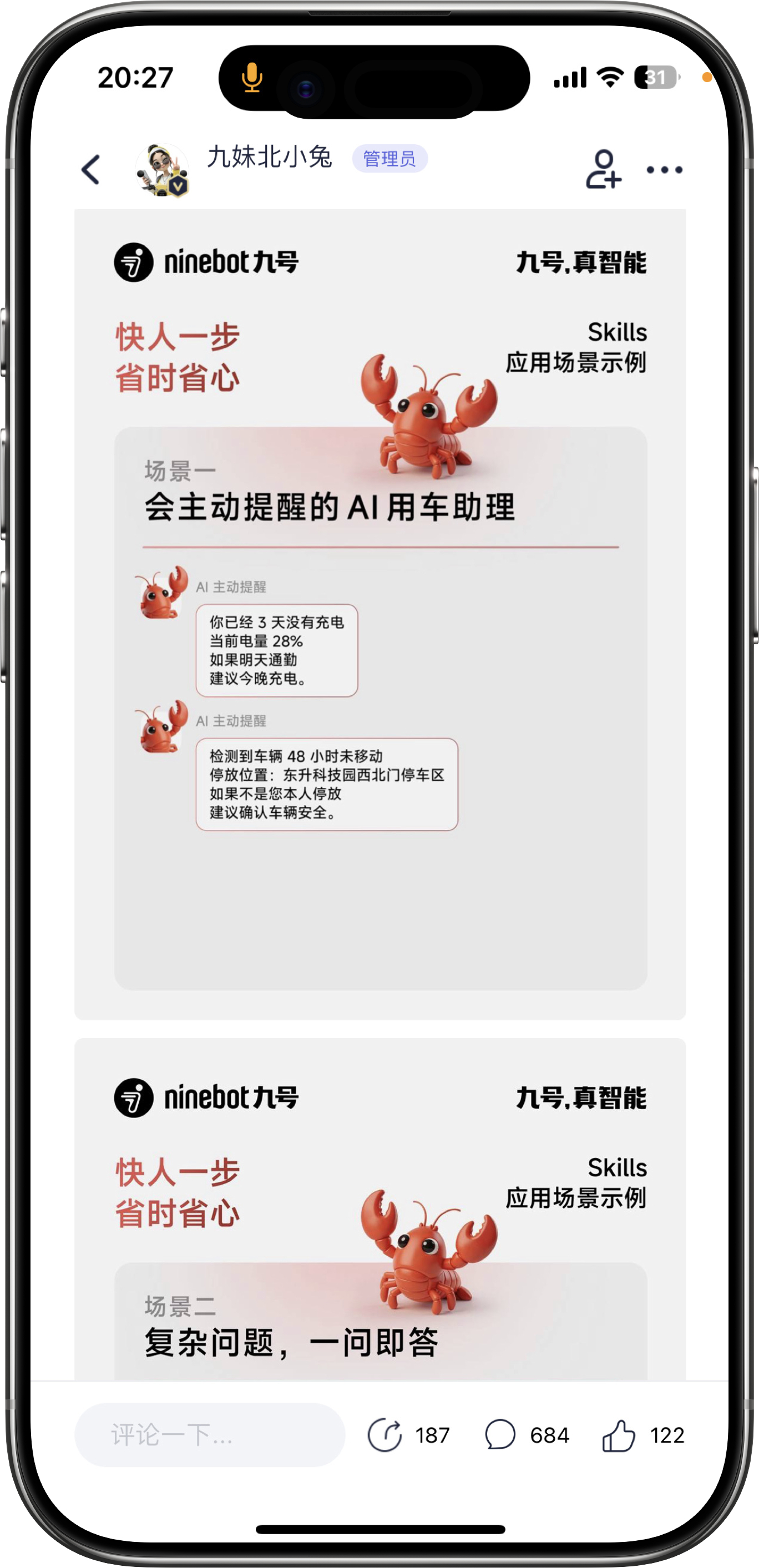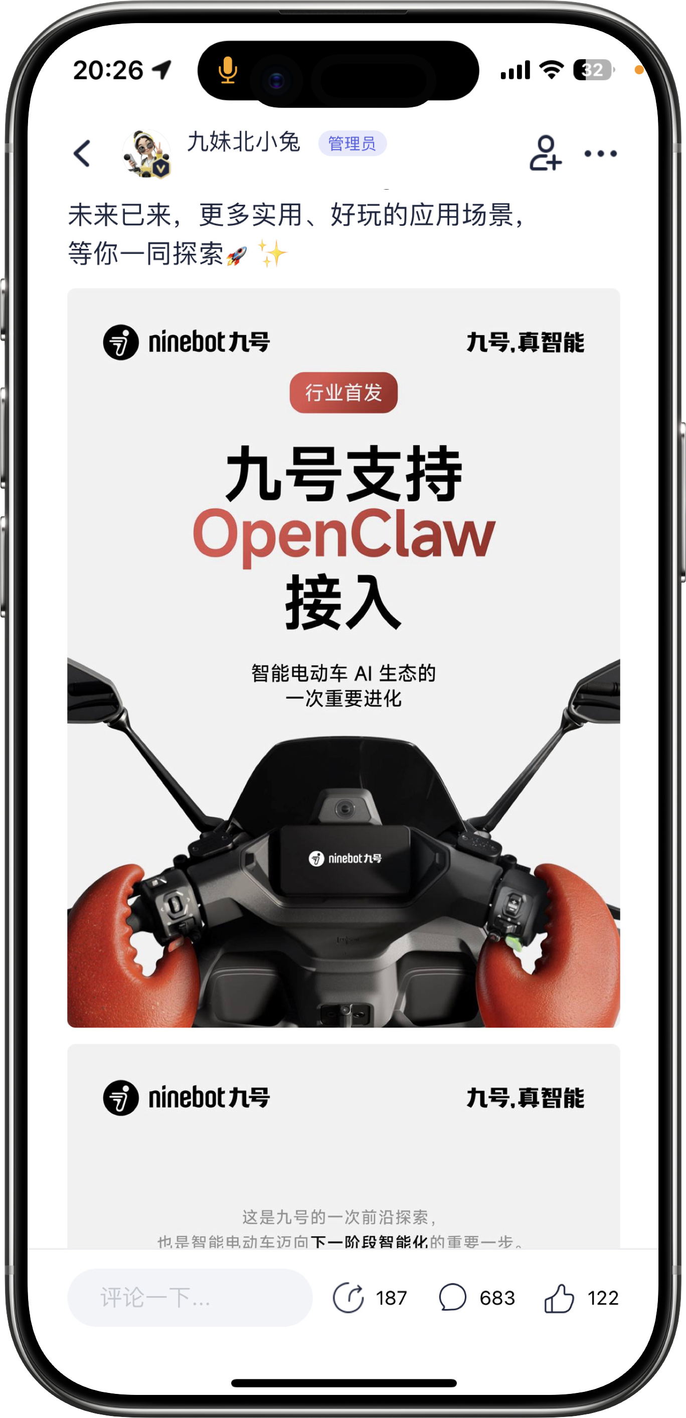 九号电动车也宣布接入OpenClaw了,接入后的主要功能是AI用车助理和定时播报车辆的状态,现在真的是全民都搞“龙虾”了……