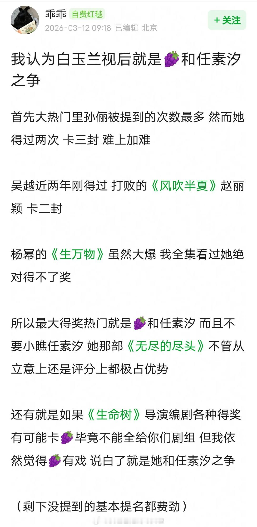 2026白玉兰预测~坦白说,有孙俪和吴越在,杨幂拿奖的概率不大。生万物确