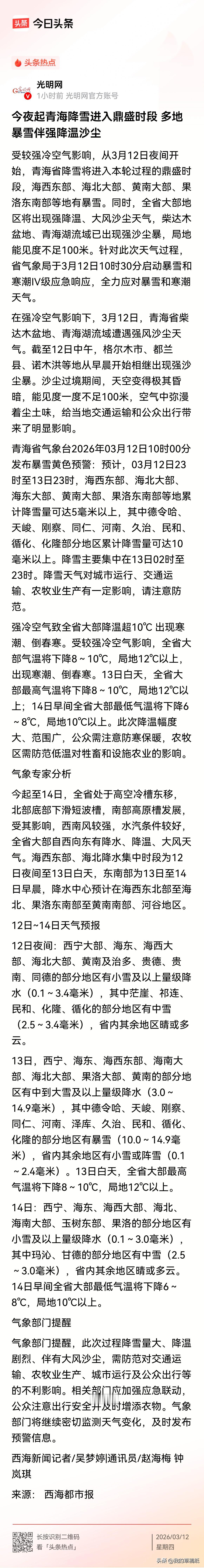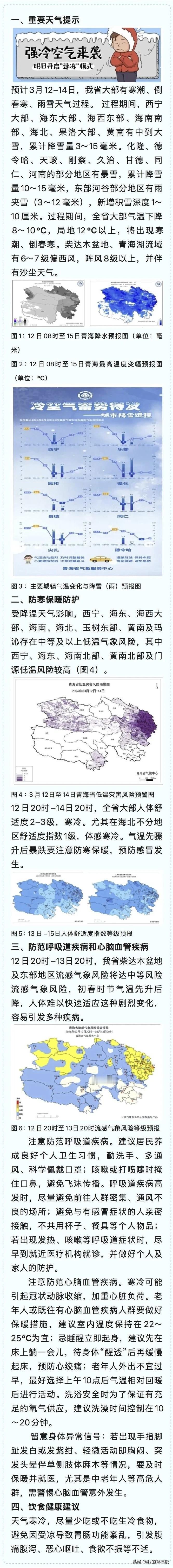 青海今夜暴雪+大风+沙尘齐袭,西宁直接冻透! 注意了!今晚别乱跑,天气要搞大事了! 就在刚刚,西宁气象台连发预警:大风黄色预警生效,未来几小时四区刮7级以上大风,阵风直接冲到8级,窗户都能吹得哐哐响。 从今夜开始,青海全省降雪进入“鼎盛”时段,多地直接下暴雪,还搭配强降温、沙尘天气,三合一暴击。 气温狂降14℃以上,明天白天最高温跌破0℃,后天早上低到-6℃以下,一秒回到深冬。 开车的一定慢点开,路面容易结冰打滑;出门必须穿厚衣服、戴口罩,防风又防沙。 老人小孩尽量别外出,关好门窗,把厚被子、羽绒服都翻出来吧。 春日生活打卡季 青海气象预报 青海大范围降雪 西宁刮大风