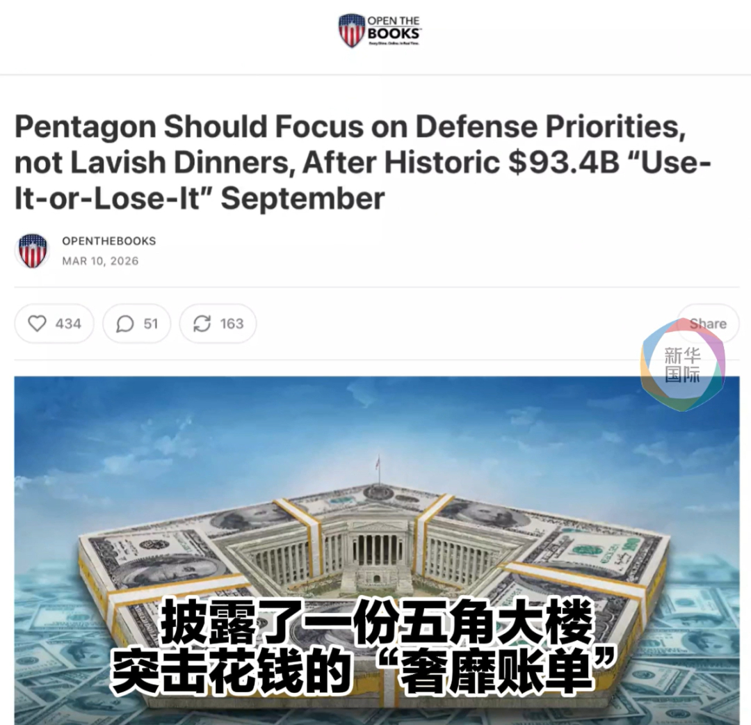 最近,美国非政府组织“公开账目”发布报告,披露了一份五角大楼突击花钱的“奢靡账单”:高档家具、豪华乐器,还有成堆的帝王蟹腿、龙虾和牛排。这大手笔的花销发生在突袭伊朗数月前。