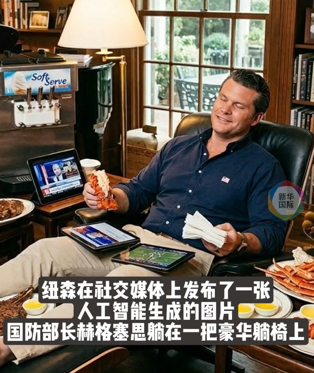 加州州长纽森在社交媒体上发布了一张人工智能生成的图片,画面中,国防部长赫格塞思躺在一把豪华躺椅上,身边环绕着三角钢琴、成堆的平板电脑以及装满龙虾尾和牛排的盘子。配文更是直接开火:“一个月挥霍了930亿美元的纳税人资金!” 据新华社