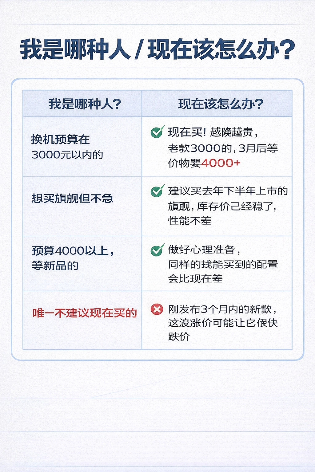 为何中端手机集中涨价 这波中端机涨价,最核心的推手就是存储芯片价格疯涨,根源是 AI 产业疯狂虹吸产能。AI 服务器对存储的需求是普通服务器的数倍,巨头们直接包圆了大部分先进产能,存储厂商自然把产能转向利润更高的 HBM,手机用存储陷入结构性缺货。三个月内闪存价格涨超 300%,成本压力直接传导到终端,中端机首当其冲。