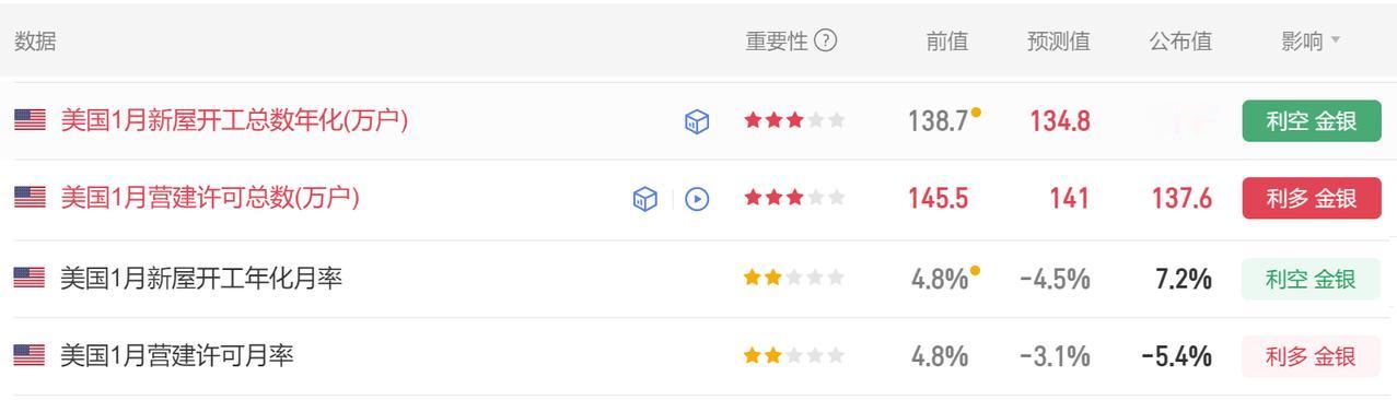 今晚公布的经济数据比较多。 首先美国1月新屋开工总数年化 148.7万户, 市场预期134.8万户,前值由140.4万户修正为138.7万户。 其次美国1月营建许可总数 137.6万户, 市场预期141万户,前值145.5万户。 最后美国1月新屋开工年化月率 7.2%, 市场预期-4.5%,前值由6.20%修正为4.8%。 还有美国1月营建许可月率 -5.4%, 市场预期-3.1%,前值4.8%。 这几项数据有利多金价, 也有利空金价的, 因此数据公布以后, 震荡运行,略微回落几美元。