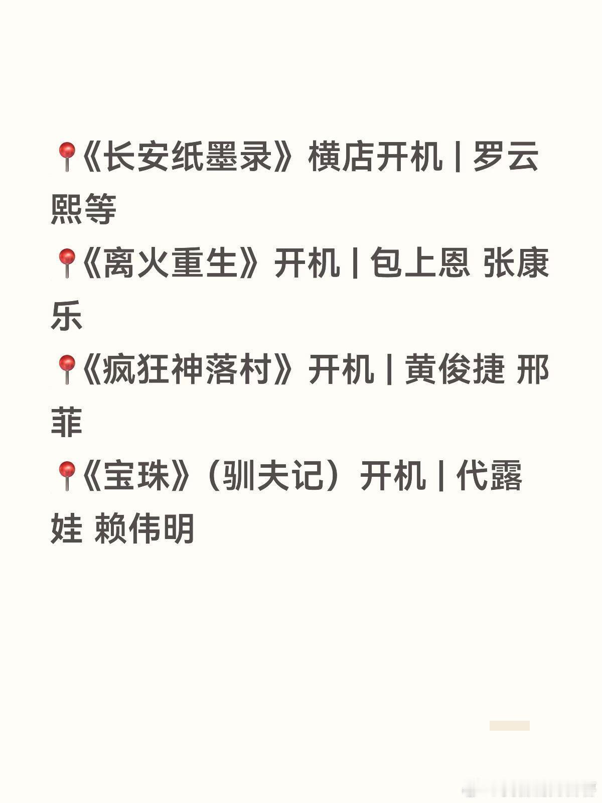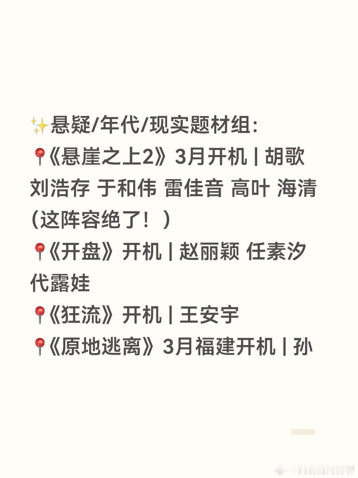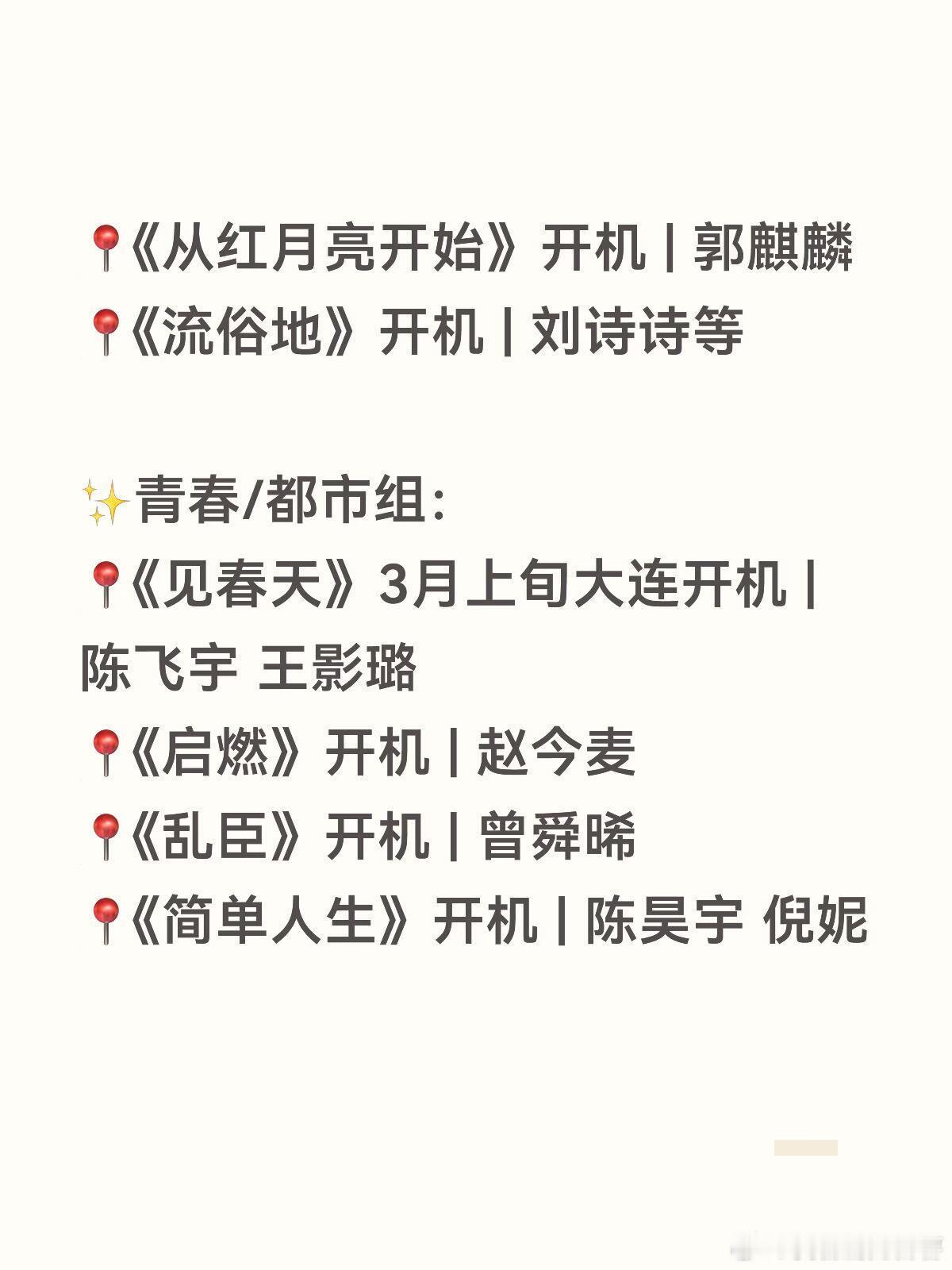 赵丽颖、杨幂、王安宇、张凌赫新剧开机家人们!三月的开机剧组真的太多了吧!🎬整理了一份超全片单,感觉接下来的两年都不怕剧荒了!😭✨现言/古言/仙侠组:📍《攻玉》开机 | 侯明昊 鹤男📍《恰逢雨连天》开机 | 丁禹兮📍《神仙肉》开机 | 虞书欣📍《雾里青》开机 | 李现 章若楠📍《掌事》开机 | 周也📍《庶女生存手册》开机 | 邓恩熙📍《刺棠》开机 | 张凌赫📍《等风热吻你》开机 | 孟子义📍《凤不栖》3月底开机 | 吴谨言 魏哲鸣 郭晓婷✨悬疑/年代/现实题材组:📍《悬崖之上2》3月开机 | 胡歌 刘浩存 于和伟 雷佳音 高叶 海清(这阵容绝了!)📍《开盘》开机 | 赵丽颖 任素汐 代露娃📍《狂流》开机 | 王安宇📍《原地逃离》3月福建开机 | 孙俪 秦海璐等📍《江山大同》开机 | 杨幂等📍《从红月亮开始》开机 | 郭麒麟📍《流俗地》开机 | 刘诗诗等✨青春/都市组:📍《见春天》3月上旬大连开机 | 陈飞宇 王影璐📍《启燃》开机 | 赵今麦📍《乱臣》开机 | 曾舜晞📍《简单人生》开机 | 陈昊宇 倪妮📍《但愿人长久》3月开机 | 张晚意 沈月📍《长安纸墨录》横店开机 | 罗云熙等📍《离火重生》开机 | 包上恩 张康乐📍《疯狂神落村》开机 | 黄俊捷 邢菲📍《宝珠》(驯夫记)开机 | 代露娃 赖伟明