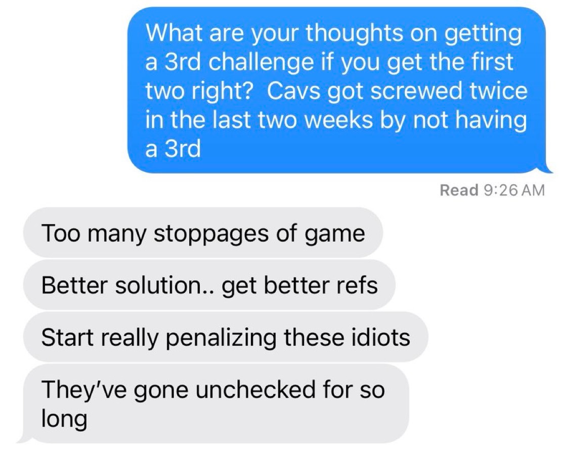 “今天早上我和几位 NBA 教练/人员聊了聊关于‘如果前两次挑战成功就能获得第三次挑战’的想法。这是我觉得最好的回答(而且他说得对)。”
