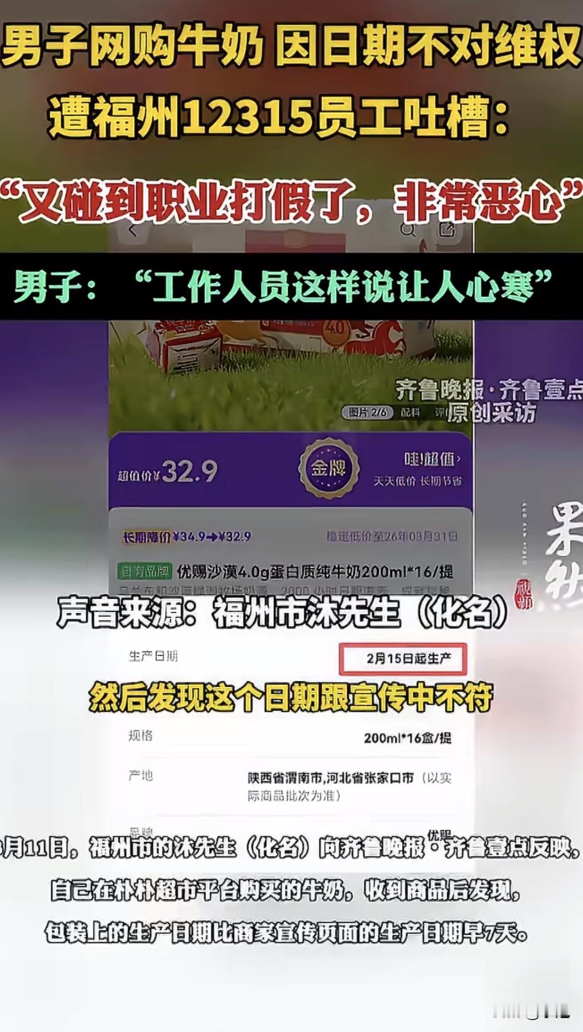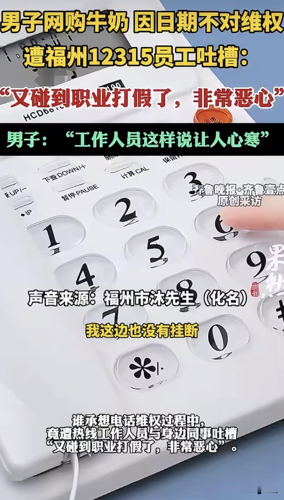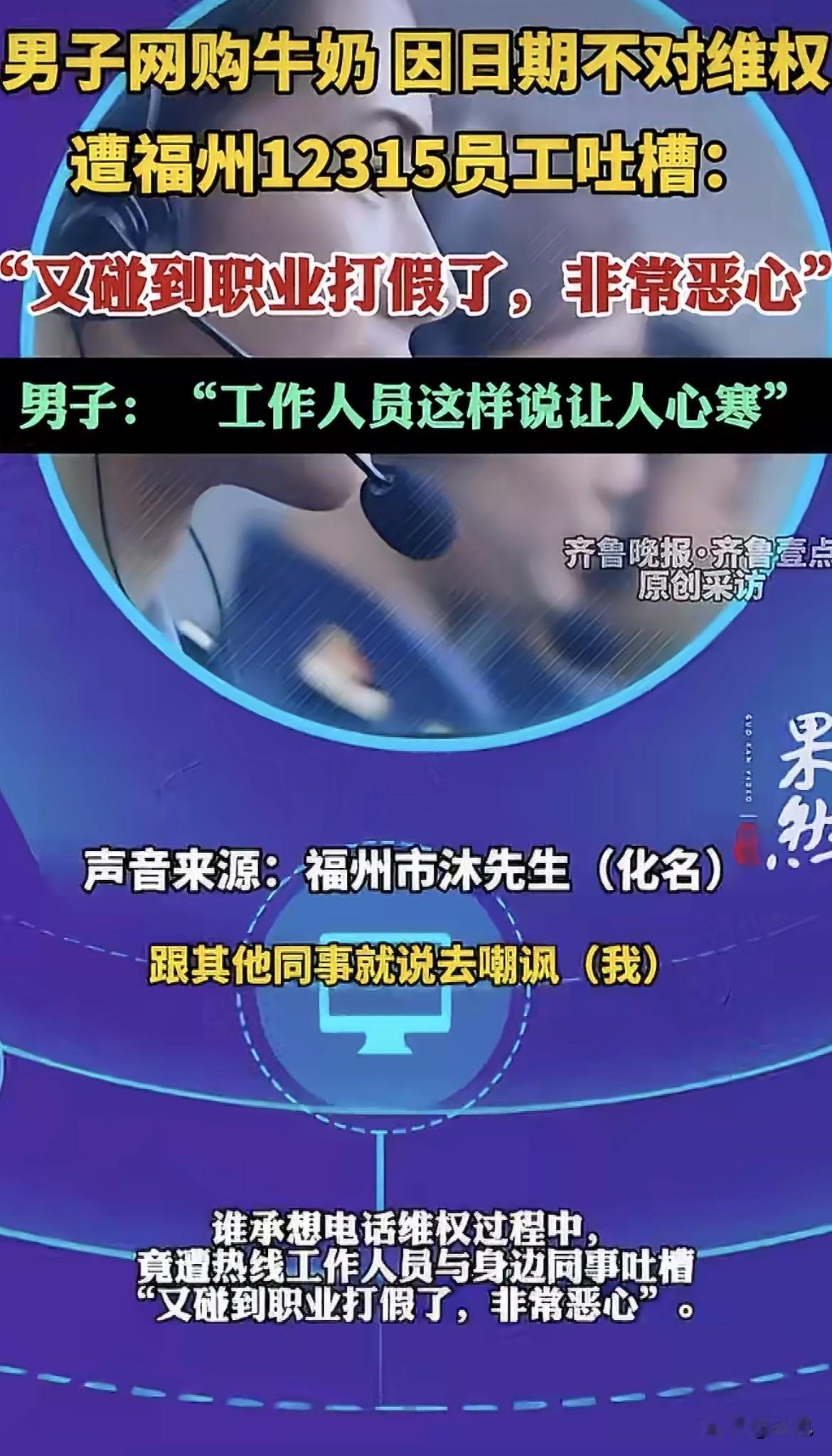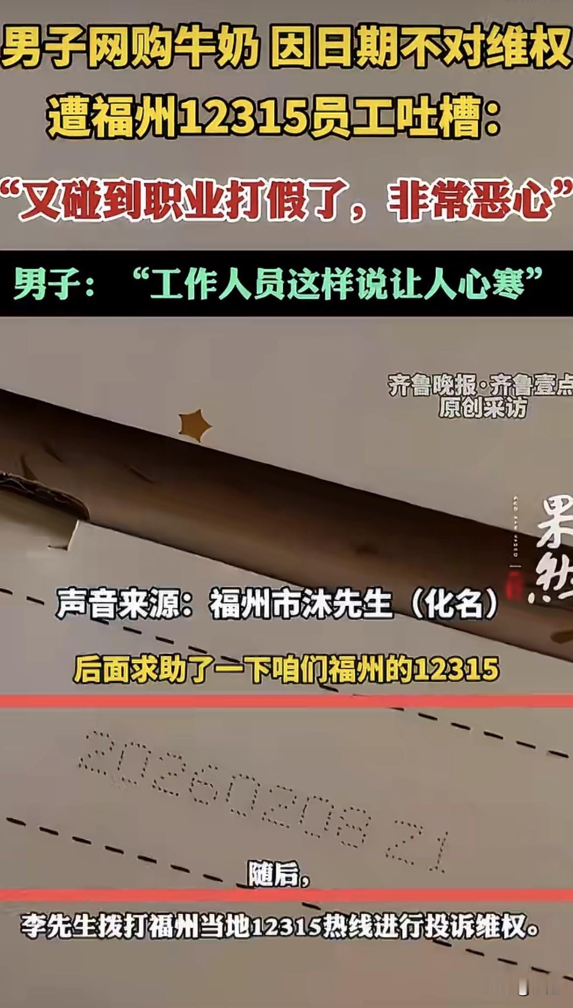 投诉维权的人,反被处理投诉的人骂“恶心”。 福州沐先生他网购的牛奶,到手发现包装日期比商家宣传的早了7天,就打了12315想问问这情况怎么处理。 结果电话那头,话还没说上几句,接线员扭头就跟旁边同事嘀咕了一句,声音不大不小,正好能让他听见:“又碰到职业打假的了,非常恶心。” 就这一句话,把沐先生整不会了。自己就是个普通买东西的,日期对不上想问一嘴,怎么就成“职业打假”了?怎么就“恶心”了? 查一下福州12315的工作流程就知道,按规定,接到投诉得第一时间响应,联系诉求人确认细节。可实际执行起来,有些工作人员每天面对海量投诉,早就形成了条件反射。 特别是这几年,职业索赔的人确实多。遂平县市场监管局去年就碰到过一个人,从深圳跑到河南,买三瓶啤酒每种只买一瓶,然后投诉要奖励,一看就是职业的。武陵源那边更有夸张的,有人几年时间投诉了八百多件。 见多了这种专门找茬要钱的,工作人员脑子里的“警报”就容易被误触。一听是生产日期的问题,第一反应不是核实情况,而是“又来一个”。 问题是,沐先生真的过份吗?商家宣传的和实际发货的日期对不上,消费者问一句,这不是天经地义的事吗? 那些真正的职业打假人,像四平市监局总结的,要么跨地区地毯式扫货,专挑小商品找标签毛病;要么在网上频繁下单,就盯着网页宣传瑕疵索赔。可沐先生就是买了一箱牛奶,发现日期不对,这跟“职业”两个字沾边吗? 工作人员那句吐槽,把两种完全不同的情况混为一谈了。真正的职业索赔确实让人头疼,遂宁市监局的数据显示,当地去年12315平台收到的投诉里,可能属于职业打假的占了13%。霍邱那边更高,将近四分之一。这些人占用大量行政资源,基层执法人员压力确实大。 但压力大归压力大,不能把正常的消费者维权也一棍子打死。沐先生买的是喝的牛奶,日期差了7天,这本身就是一个合理疑问。国务院指导意见里说的“依法规范牟利性打假”,规范的是“牟利性”,不是普通消费者的正常维权。 电话里那句“恶心”,说到底,是工作人员见多了“狼来了”,把真正来问路的也当成了狼。沐先生最后说,维权被污蔑,真让人心寒。 这话听着特别不是滋味。他那一箱牛奶,差了7天的日期,最后怎么处理的没人知道。但那个电话里传来的那句吐槽,估计比牛奶本身更让他堵得慌。 大家要是买东西碰上这种事,还会打12315吗?或者你觉得,怎么分辨普通消费者和职业打假的? 来源:海报新闻