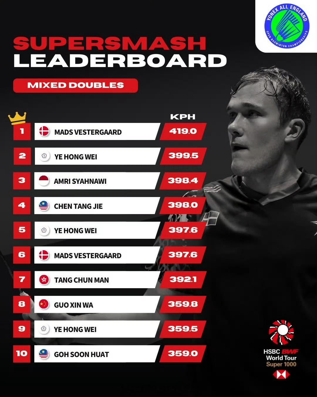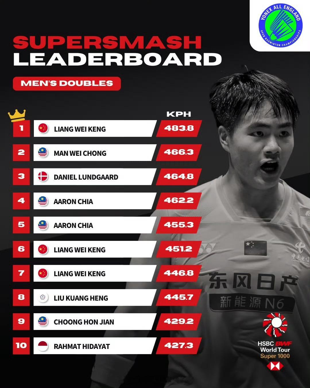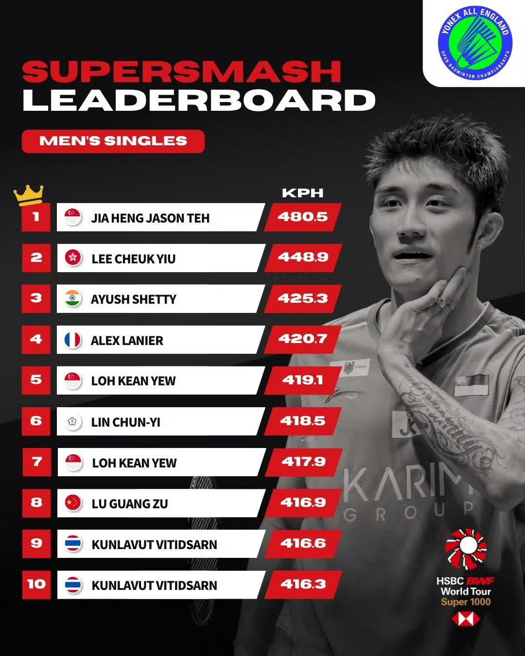 2026全英羽毛球公开赛各单项杀球时速排行榜🔝