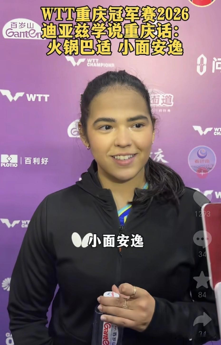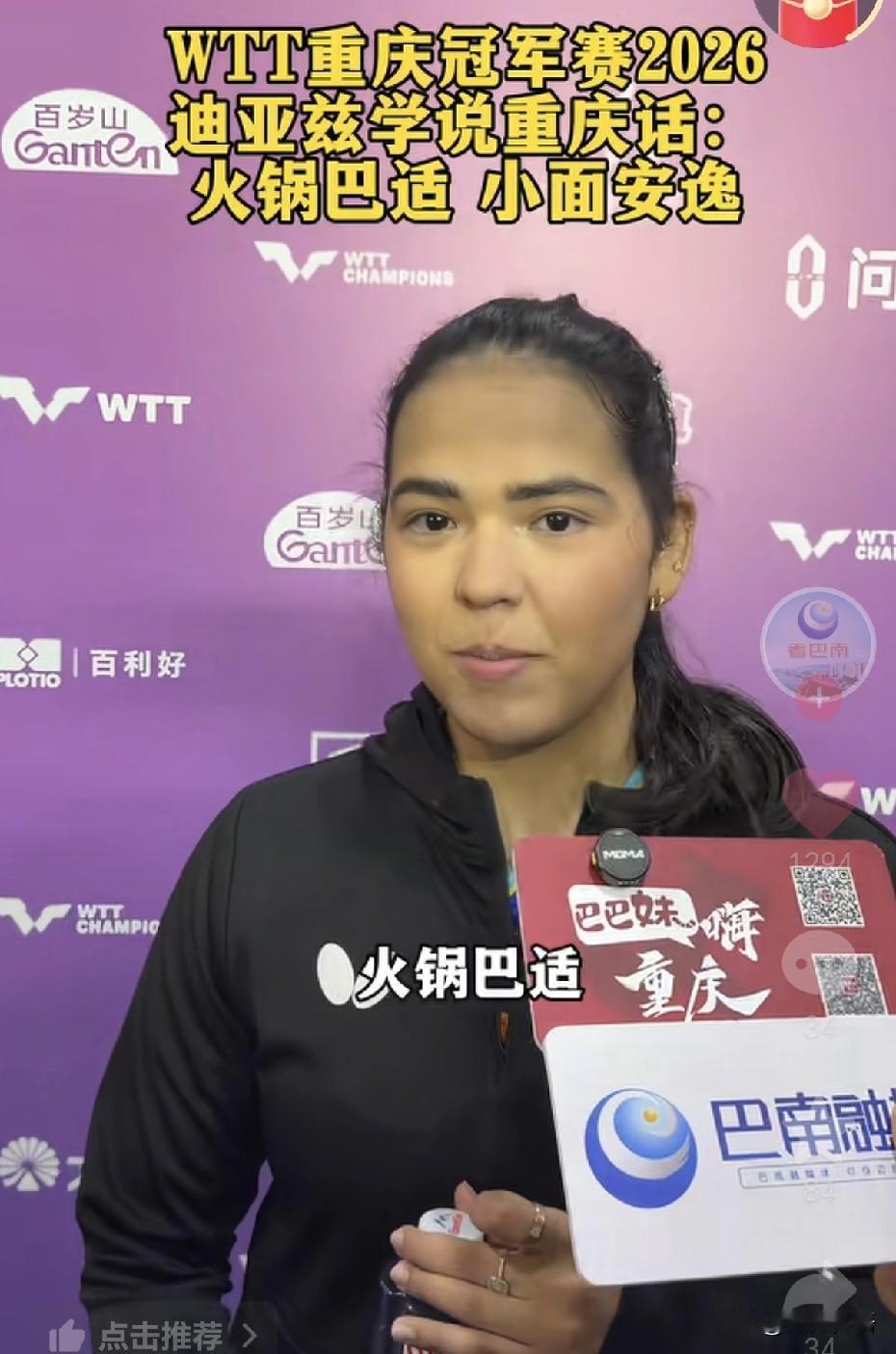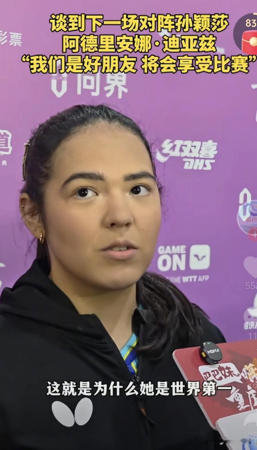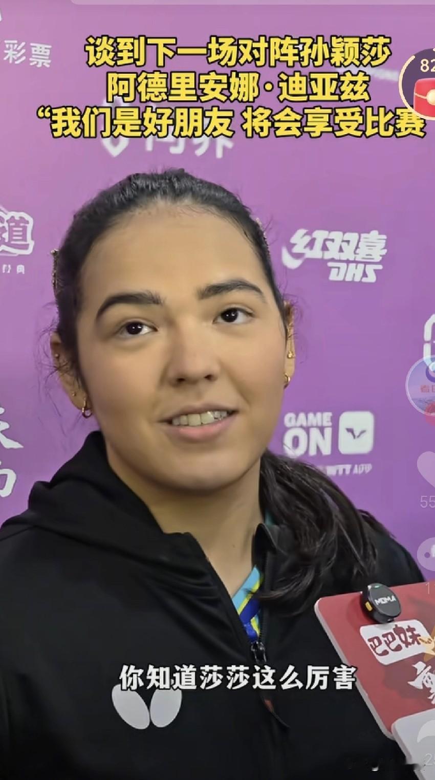 迪亚兹学习重庆话:火锅巴适,小面安逸。不得不说迪亚兹学的很好呢,以前的采访中,迪亚兹说她会教莎莎讲英文,莎莎会教她说中文,俩人是好朋友,不过明天两个好朋友要在赛场上相见了。 不过迪亚兹确实瘦了很多,变得更漂亮了,每次迪亚兹见到莎莎都会笑的很娇羞,明天迪亚兹出场的时候估计又要憋笑了。每次采访,迪亚兹都会说和莎莎是好朋友,她说:“你知道莎莎这么厉害,这就是为什么她是世界第一”。迪亚兹说明天和莎莎的比赛,将会享受比赛。 迪亚兹现在也涨球了,不好打,而且迪亚兹很多手感球打的非常好。莎莎今天赢下比赛后,心情也非常不错,明天跟好姐妹打比赛,也没有太大的压力,现在都可以想象到她俩打完比赛的场景,肯定两个人都开心的笑,然后握手抱抱,莎莎再夸夸迪亚兹。