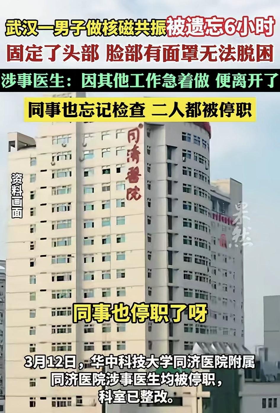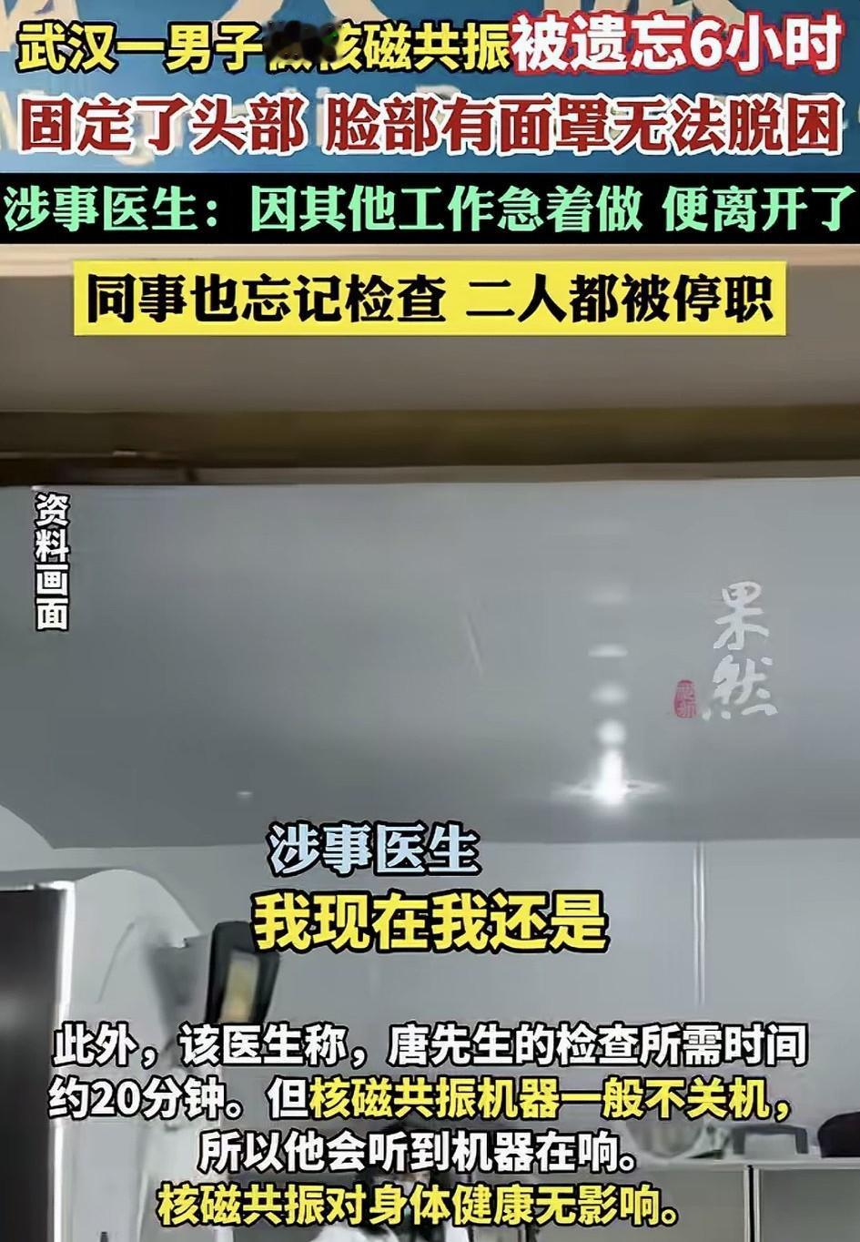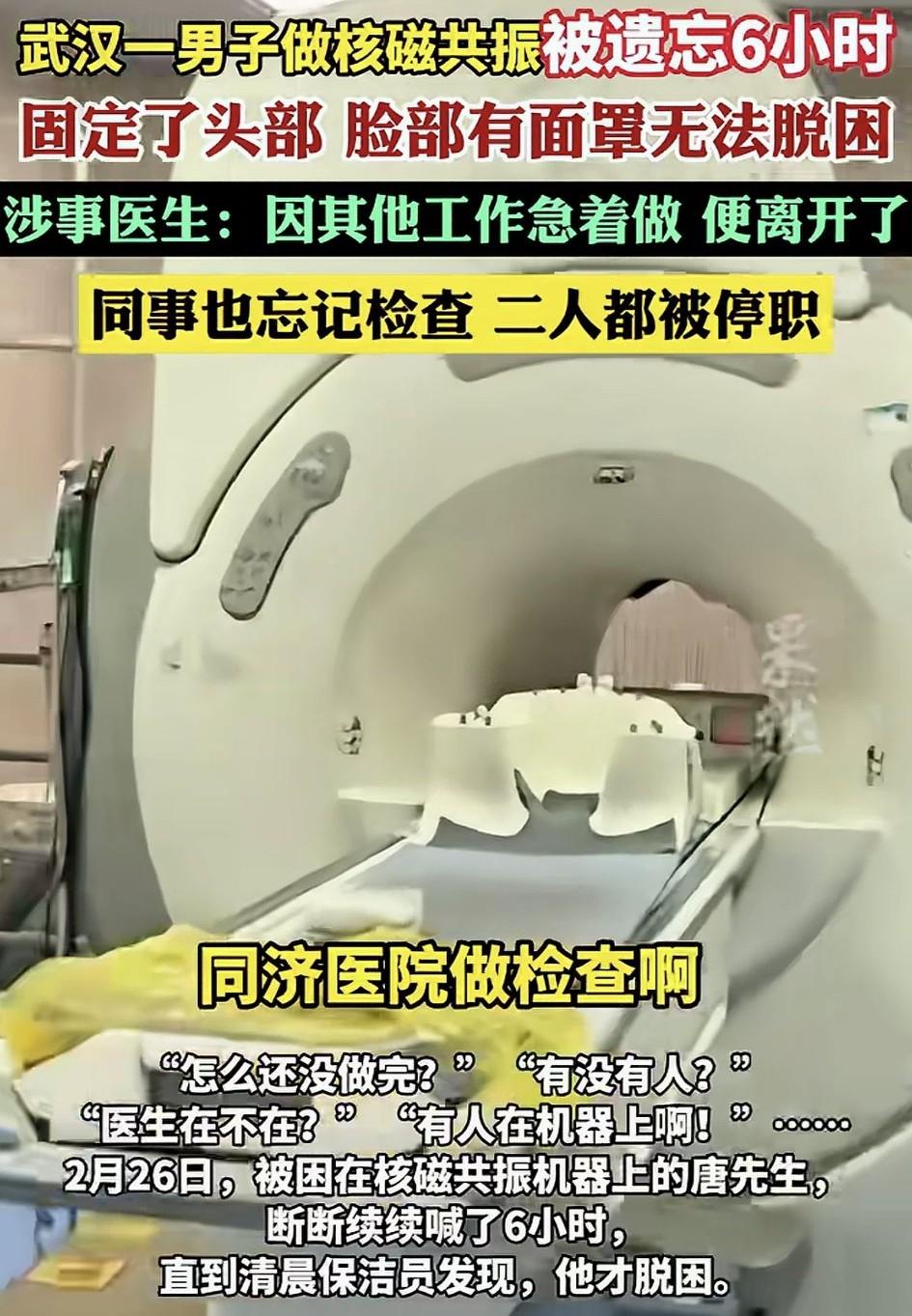 太离谱了吧!武汉,一男子因颈部疼痛深夜去当地医院做核磁共振检查,结果男子做检查时,竟因医生粗心将其遗忘在了核磁共振室,导致男子被固定在机器上了6小时。直到清晨六点,保洁员打扫卫生时,听到男子呼救后才将其解救。 据男子描述,当时他躺在核磁共振机上时,头部被固定,脸部还罩了面罩,之后差不多半小时了也没有动静,于是男子便开始呼喊询问,为什么还没有做完?但始终无人应答。 后又因机器作响不敢动弹,男子就这样在机器上喊了足足6个小时。直到清晨6点,保洁听到呼救声后,才叫来保安帮其脱困。 事后保安称,系统显示检查已完成,监控也未找到人。而涉事医生则称,因固定男子后,因有急事离开,系统标“已完成”并告知同事,但同事却粗心大意未对核磁共振室检查就关了门,从而导致了此次事故的发生。 目前,两名涉事医生均被停职,事发当天科室也开会整顿,并提醒成员一定要仔细检查是否有患者遗留。医院面对此事,也已向男子进行了诚恳道歉,而赔偿问题双方正在协商。 不得不说,身为一名合格的医院持证专业技术人员,怎么会犯如此离谱低级的错误?这何止是粗心大意,完全就是对工作的不认真不负责任!试想一下,倘若二人交接班时仔细认真一点,也不会出现这个事故吧。 站在医务工作者的角度来说,因工作非常特殊,服务对象更是病人,应该做到不得有半点马虎,因为可能这半点马虎,都会对病人健康造成不同程度的伤害。所以无论是交接班,还是操作流程,都应该仔细认真对待,像就这种不负责任工作态度,不但要罚,更应该重罚! 同时也提醒所有医务人员,我们的工作直接关系到人的生命健康,任何细微疏忽和大意,都可能造成患者不可逆的严重后果, 这也是医疗行业对严谨性的极致要求,希望大家都引以为戒!