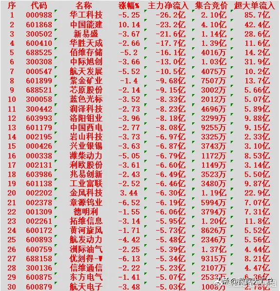 华工科技 主力净流入-26.2亿中国能建 主力净流入-23.2亿新易盛 主力净流入-21.6亿华胜天成 主力净流入-17.7亿佰维存储 主力净流入-16.1亿中际旭创 主力净流入-13.0亿航天发展 主力净流入-10.5亿紫金矿业 主力净流入-9.68亿芯原股份 主力净流入-9.15亿蓝色光标 主力净流入-8.33亿
