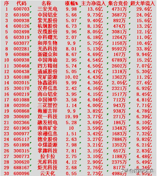 三安光电 主力净流入13.6亿中国铝业 主力净流入9.73亿紫光股份 主力净流入9.40亿杭钢股份 主力净流入8.13亿汉缆股份 主力净流入8.05亿中科曙光 主力净流入6.18亿和邦生物 主力净流入5.75亿光迅科技 主力净流入5.13亿新疆众和 主力净流入4.69亿中国海油 主力净流入4.54亿四方精创 主力净流入4.50亿通威股份 主力净流入4.47亿兖矿能源 主力净流入4.43亿协鑫能科 主力净流入4.36亿汉得信息 主力净流入4.16亿南山铝业 主力净流入4.15亿中国神华 主力净流入4.04亿三花智控 主力净流入4.00亿梅雁吉祥 主力净流入3.82亿双一科技 主力净流入3.77亿