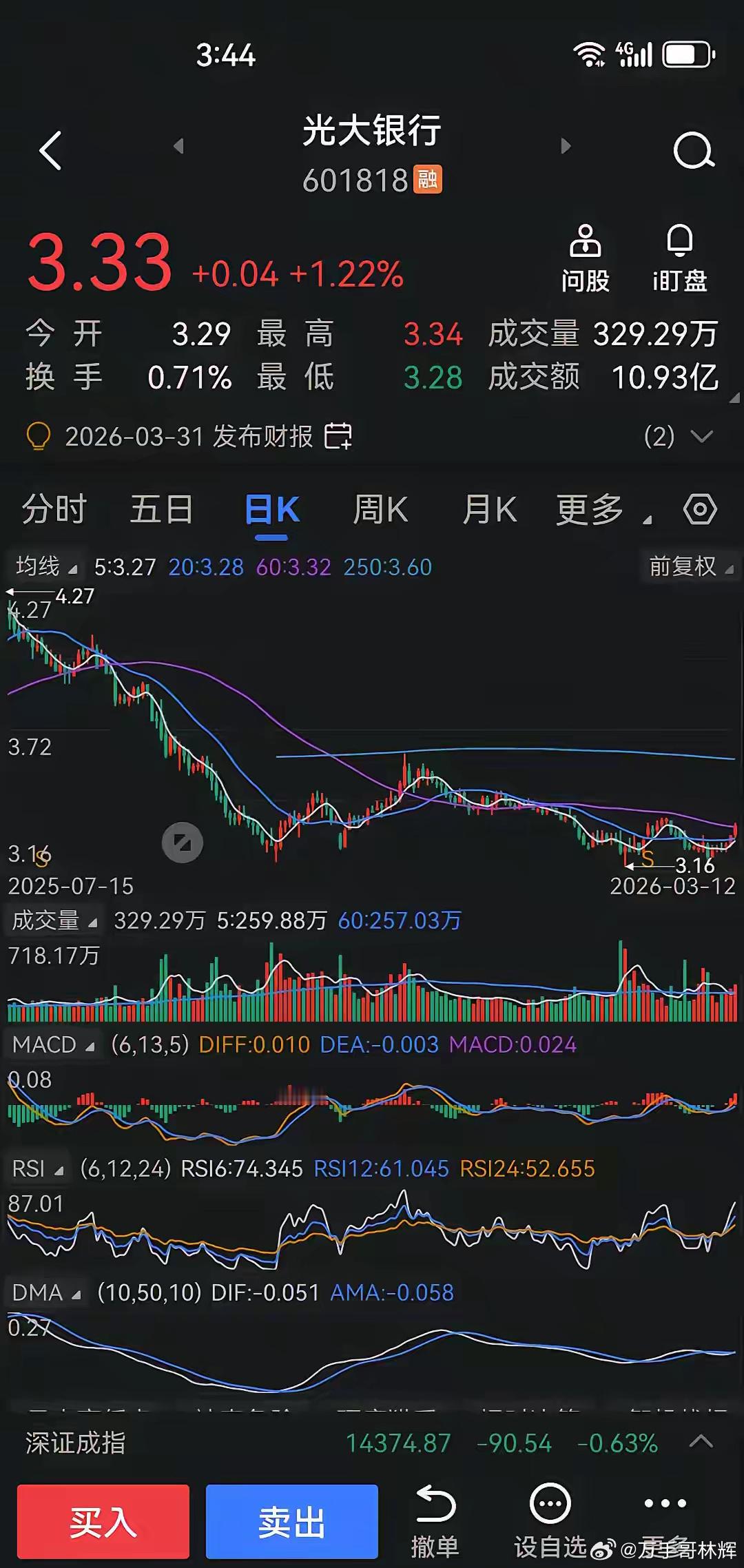 今天,光大银行以3.29元开盘,最低价3.28元,最高价3.34元,收盘价3.33元,上涨1.22%。成交金额10.93亿元,换手率0.71%。