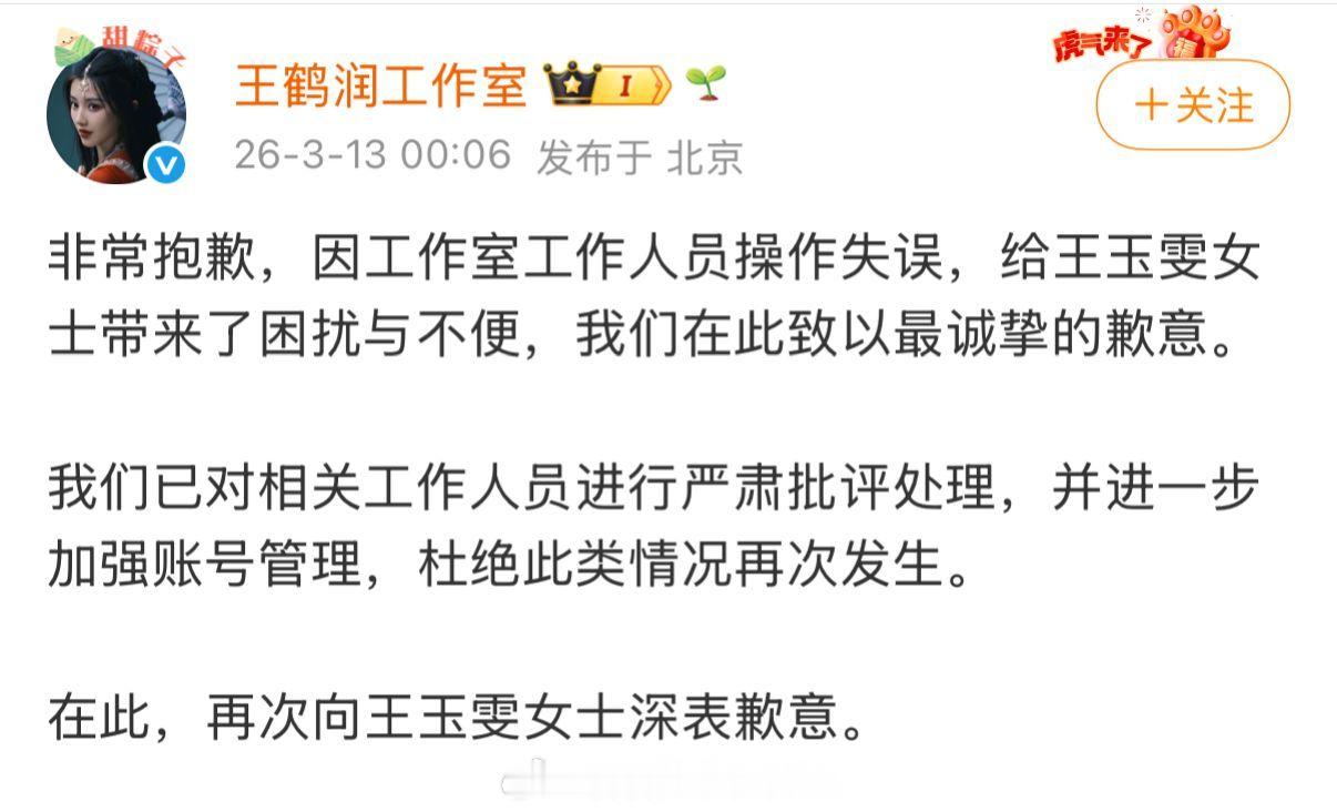 王鹤润的工作室发微博道歉,说是工作人员操作失误。