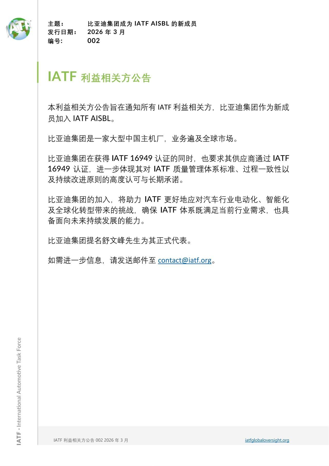 比亚迪终于有资格坐进制定国际核心标准的大桌上了!最近消息,比亚迪接收到了IATF(国际汽车工作组)的通知,宣布比亚迪正式成为该组织的成员!IATF是全球汽车质量管理体系的权威组织,长期以来都是以欧美车企成员为核心。比亚迪作为全球销量最大、核心技术专利数量最多的新能源车企,因此获得了全体成员的投票通过!随着比亚迪的加入,它将与大众、通用等国际汽车巨头共坐一桌,共同参与国际核心标准的制定!比亚迪的加入,是国际巨头们对中国新能源汽车技术的高度认可,也是中国汽车企业在国际标准领域迈进的一大步!实话实说,比亚迪现在就是中国汽车行业创新技术实力最强大的品牌之一!比亚迪会成为世界第一车企吗?