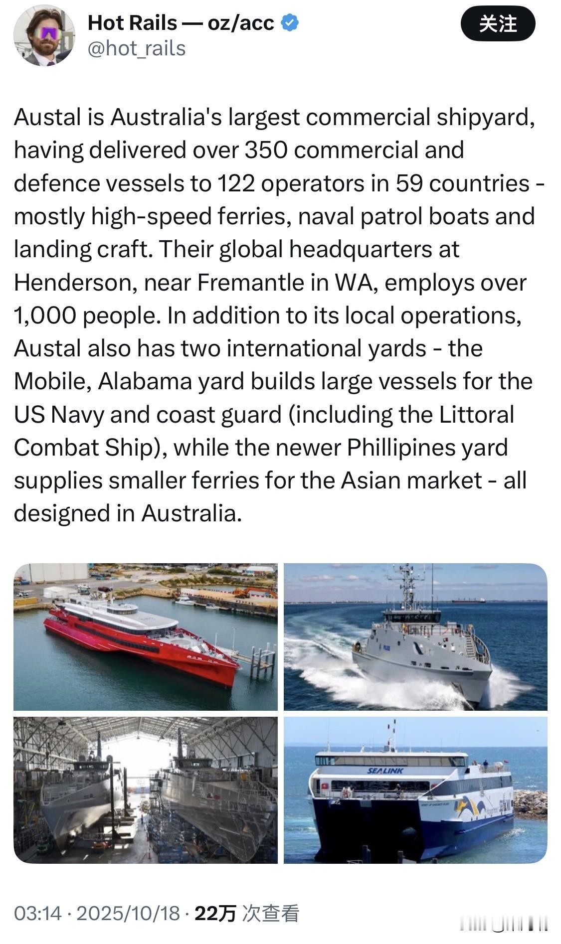 奥斯塔(Austal)是澳大利亚最大的商业造船厂,已向59个国家的122家运营商交付了超过350艘商用和军用船舶,主要包括高速渡轮、海军巡逻艇和登陆艇。其全球总部位于西澳大利亚州弗里曼特尔附近的亨德森,拥有超过1000名员工。除了澳大利亚本土业务外,奥斯塔还拥有两家国际船厂:位于阿拉巴马州莫比尔的船厂为美国海军和海岸警卫队建造大型舰艇(包括濒海战斗舰),而位于菲律宾的新建船厂则为亚洲市场供应小型渡轮——所有这些舰艇均由澳大利亚设计。