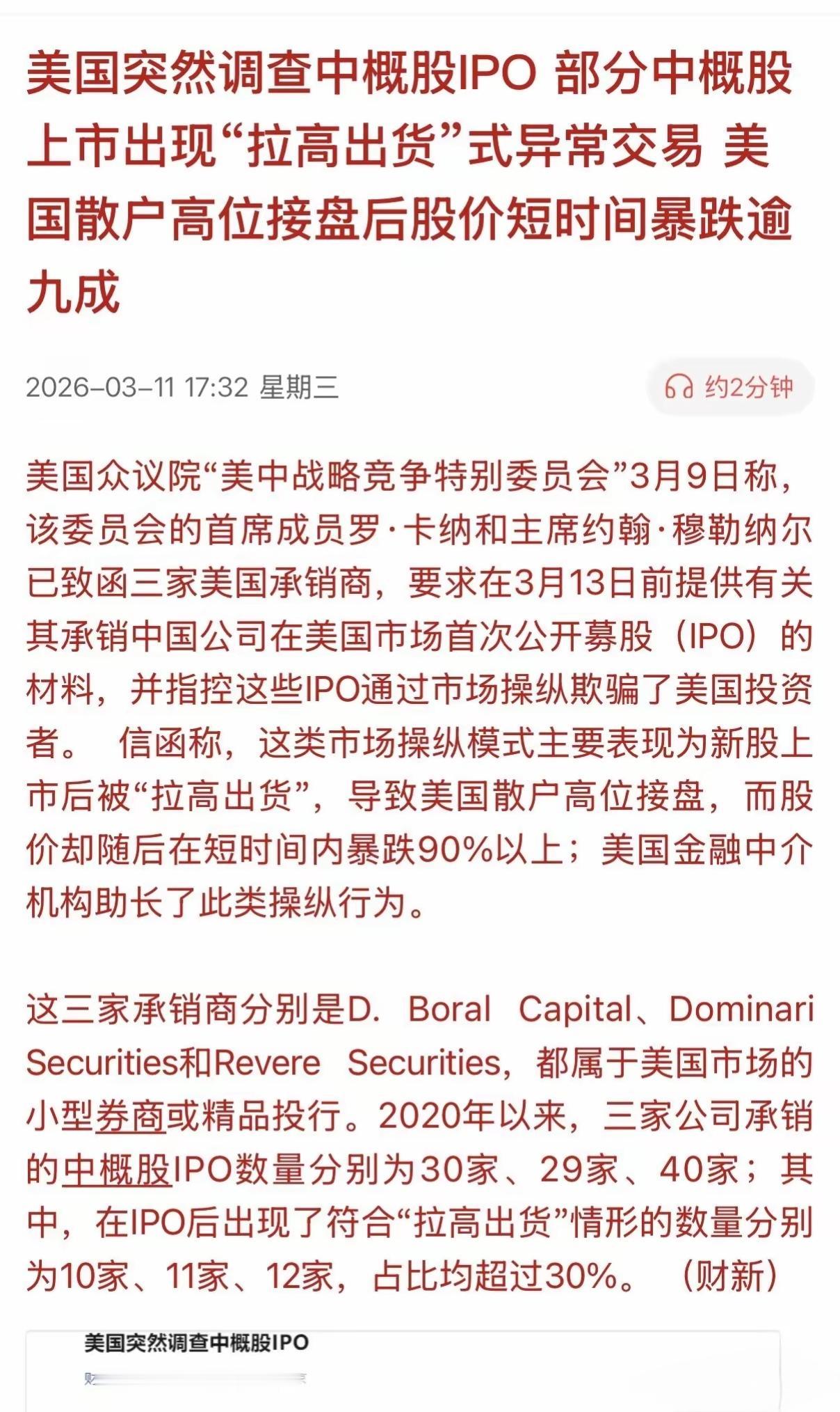 美国突然调查中概股的IPO上市,因为有部分上市公司上市过后,直接出现了拉高出货的动作,有异常交易的方式!其实美国的散户高位接盘过后,股价大幅下跌,在短期内甚至暴跌到九成! 直接就被美国方面定为欺诈,美国投资者,就是操纵股价!接下来,如果美国突然调查这些公司可能罚款,要罚到倾家荡产!美国可不是那么好搞的!