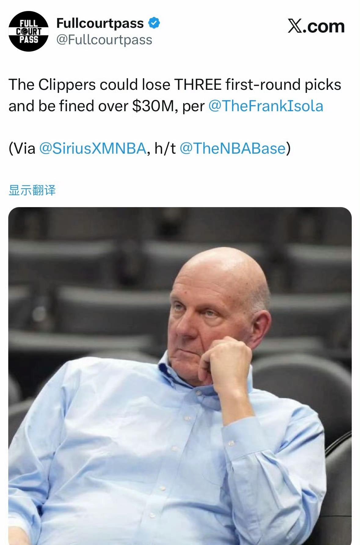 快船队可能失去三个首轮选秀权,并被罚款超过3000万美元。 怪不得小卡最近老老实实打球了,毕竟又到了合同年。 鲍尔默的钱或许不心疼,但没了首轮签,快船未来几年的重建路就太难走了。这波要是真罚下来,球队的基石算是被连根拔起了。