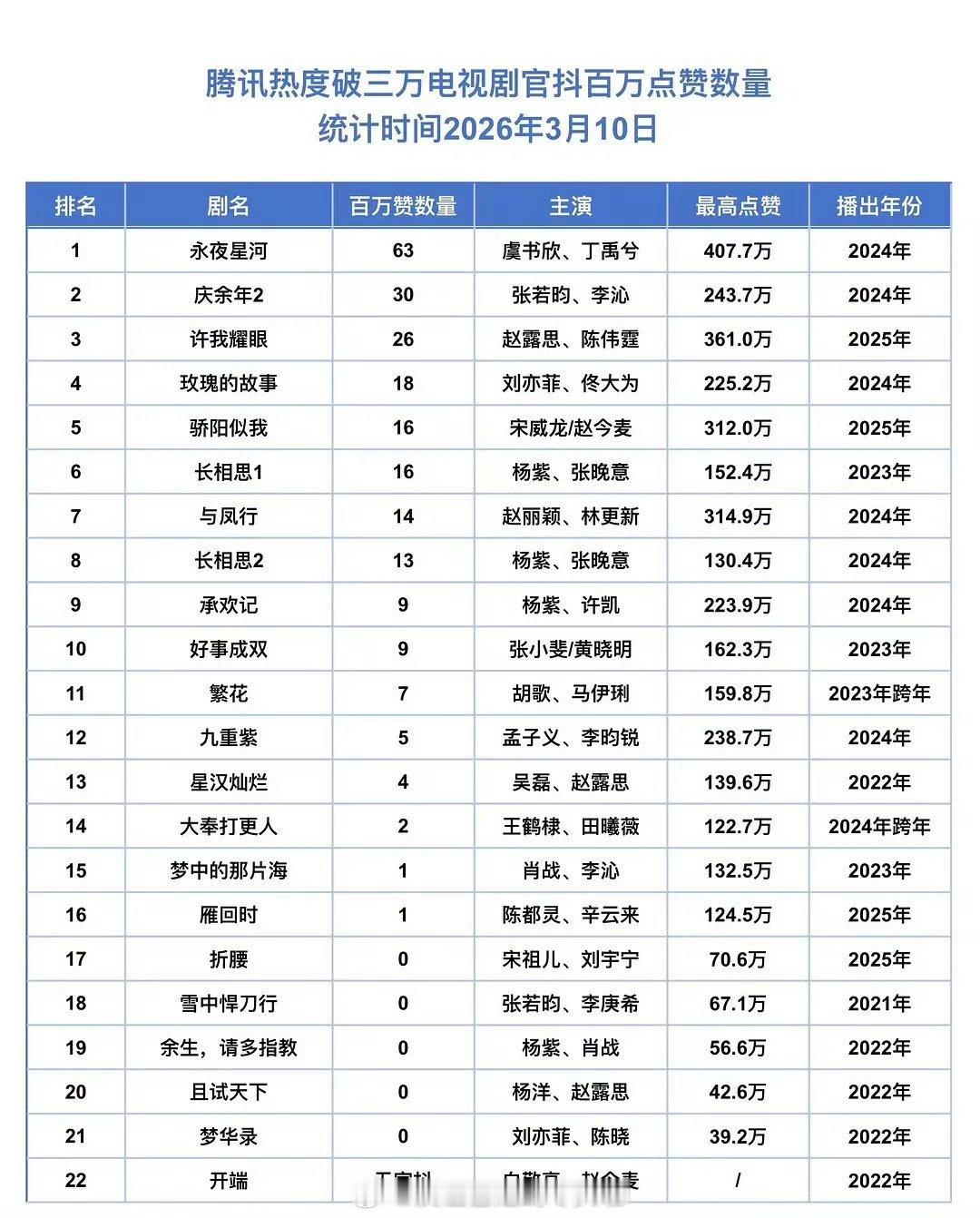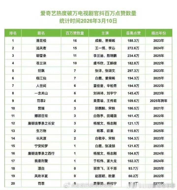 🐧🥝热播剧官抖破百万点赞视频数量统计🈶前十:永夜星河,庆余年2,许我耀眼,玫瑰的故事,长相思1,莲花楼,骄阳似我,追风者,与凤行