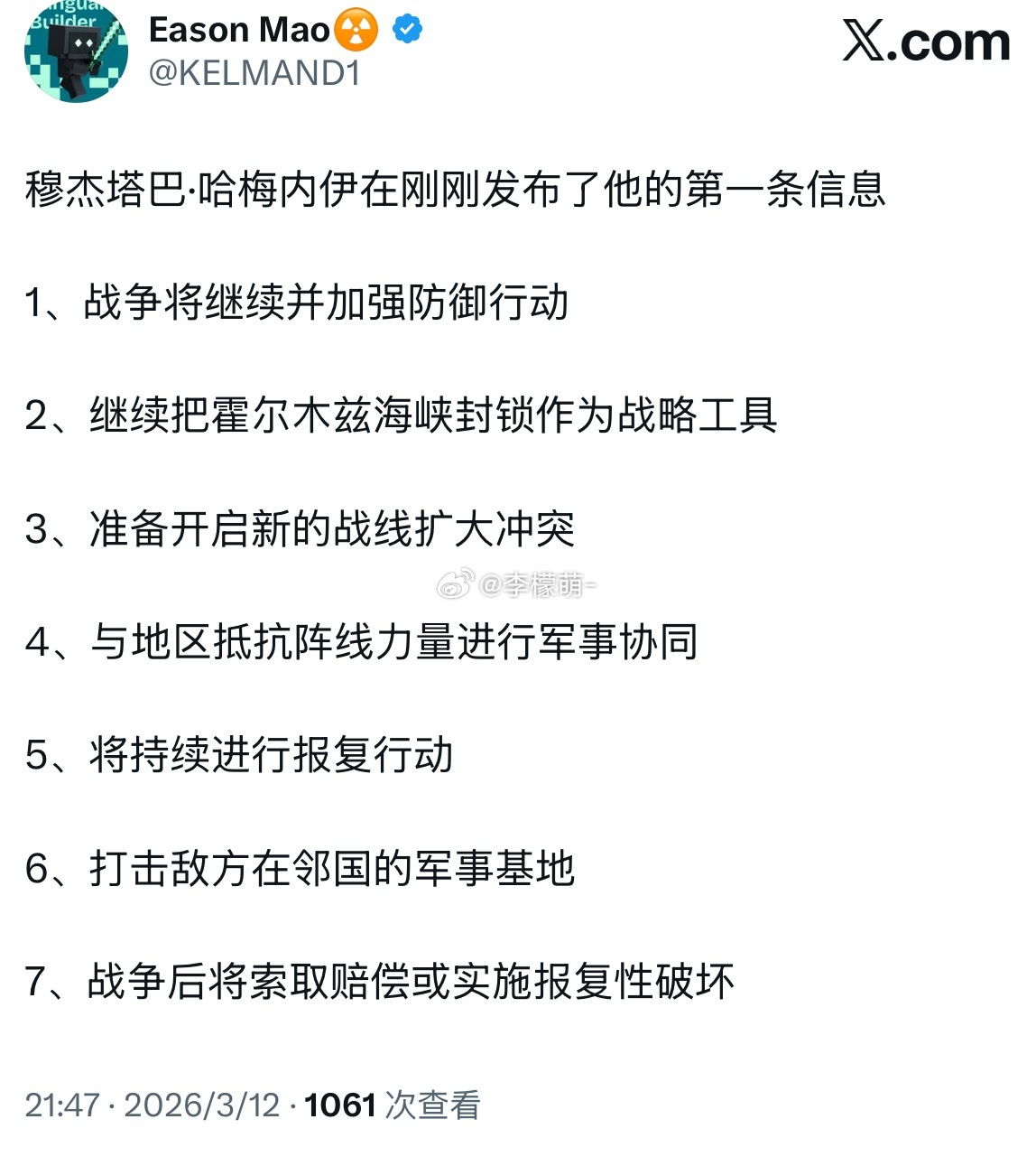 伊朗最高领袖公开声明网友:“关闭海峡不是为了打仗,是为了给美元霸权递上一份无法支付的账单。现在,能源咽喉的锁链已经扣上了,迪拜房价那 20% 的跌幅只是前菜。真正的风暴,才刚刚开始。”