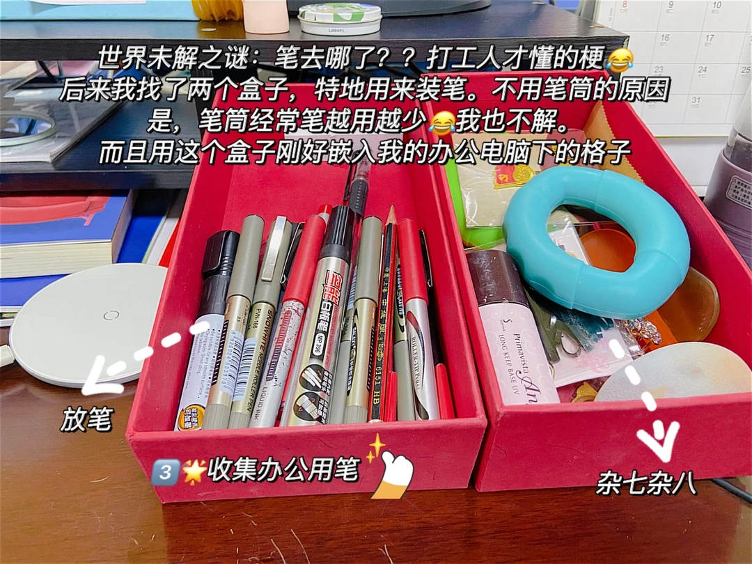 3️⃣收集办公用笔。宇宙未解之谜:我的笔哪去了?😂工作上笔经常用着用着就飞走了?莫非有藏身之处??所以我利用闲置的空盒,一边装笔,一边装杂七杂八的物件。笔越来越多了😆