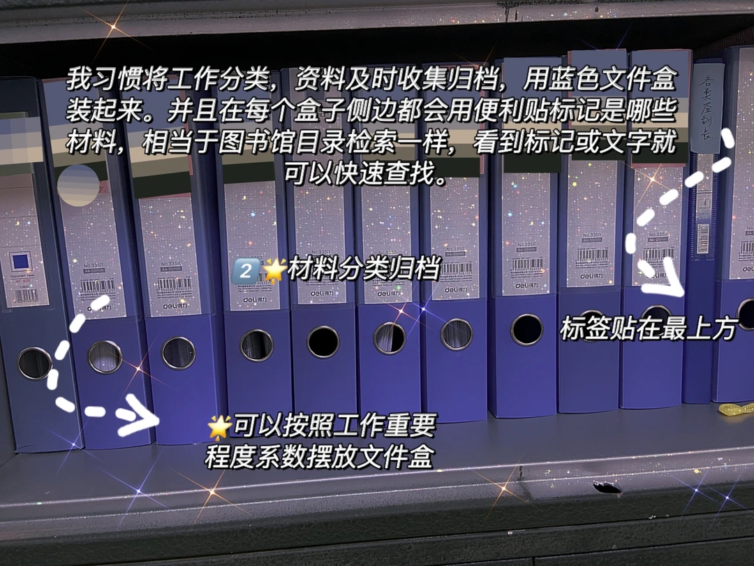 2️⃣材料分类归档。工作很杂很乱的时候一定要学会归档,不然就是桌面一团糟,很容易就产生浮躁心理。我就是用蓝色文件盒分类归档,用便利贴做好标记,查询很便捷。