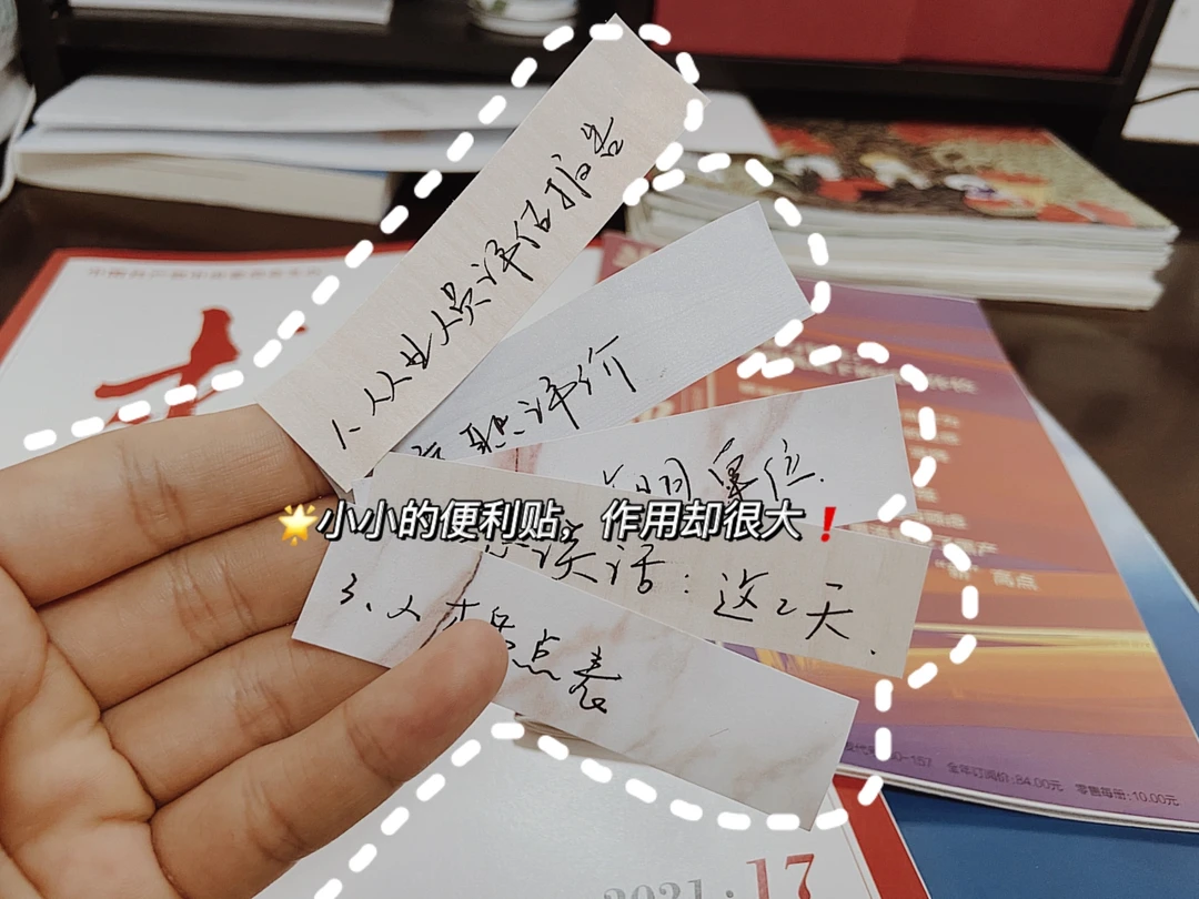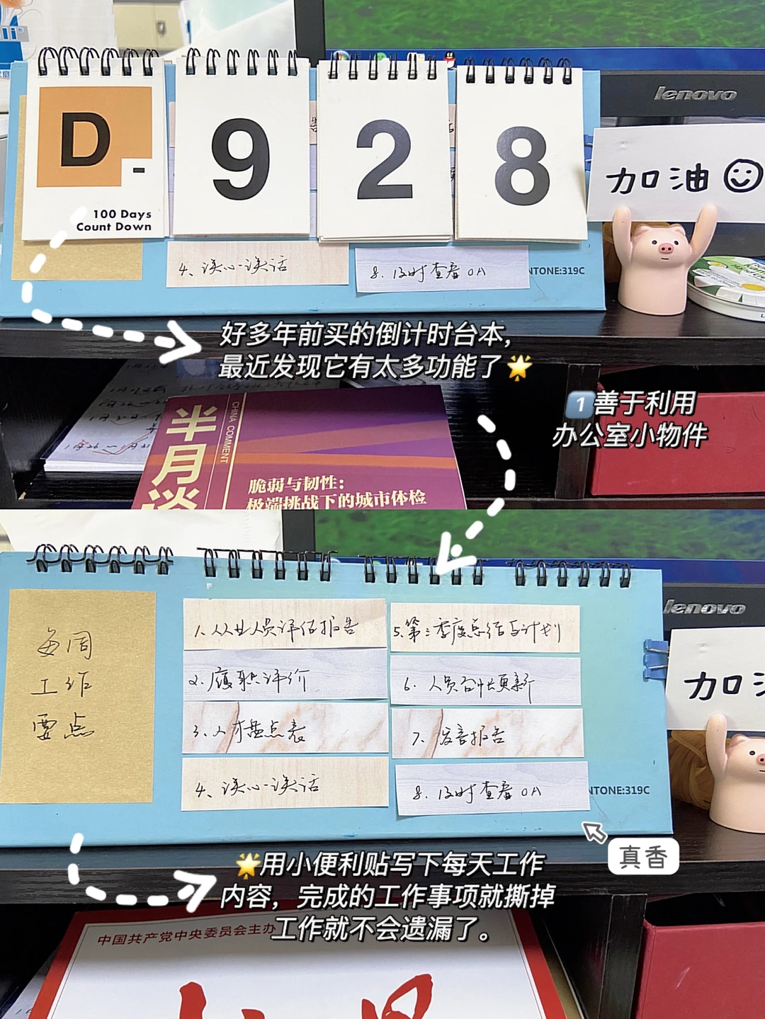 1️⃣善于利用办公室小物件。我把好多年前买的台本重新利用起来了,把工作事项写在小便利贴上,然后按照轻重缓急的顺序贴起来,完成一项就撕掉一张,这样工作就不会遗漏了。