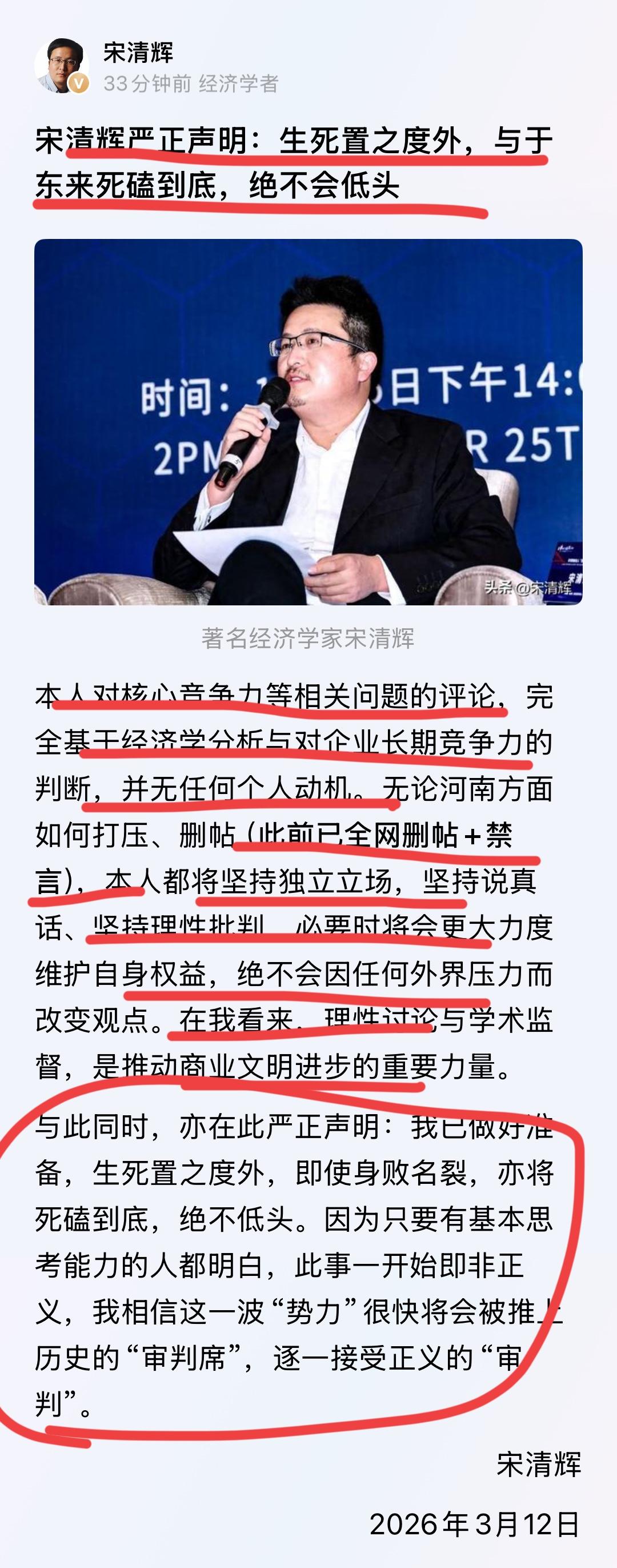 被胖东来超市告上法庭,并被判决赔偿56万之后! 著名经济学家宋清辉老师发布公开声明: 已经将生死置之度外,坚决跟于东来死磕到底,绝不妥协!! 宋清辉再次重申,自己批判胖东来,是合理的质疑; 是基于经济学的常识,做出的判断,并无个人动机; 不管如何打压,他坚决不会低头,他还要坚决的维护自己的合法权益; 并不会因为外部的任何力量而改变自己的观点。 他表示,已经将生死置之度外,坚决跟于总死磕到底,绝不妥协。 他最后说,这波势力,最终会把他们自己推向审判席,会得到公正的审判! 太狠了,太刚了,宋老师。 个人觉得,还是私下和解为好; 毕竟法院已经判决了,要么是和解,要么是上诉; 否则,这么下去,对宋老师还是不利的。 不要旧伤未好,又添新伤,这就难办了。 不过,个人以为,以宋老师的性格,一定会继续下去的; 鹿死谁手,我们只能拭目以待了!