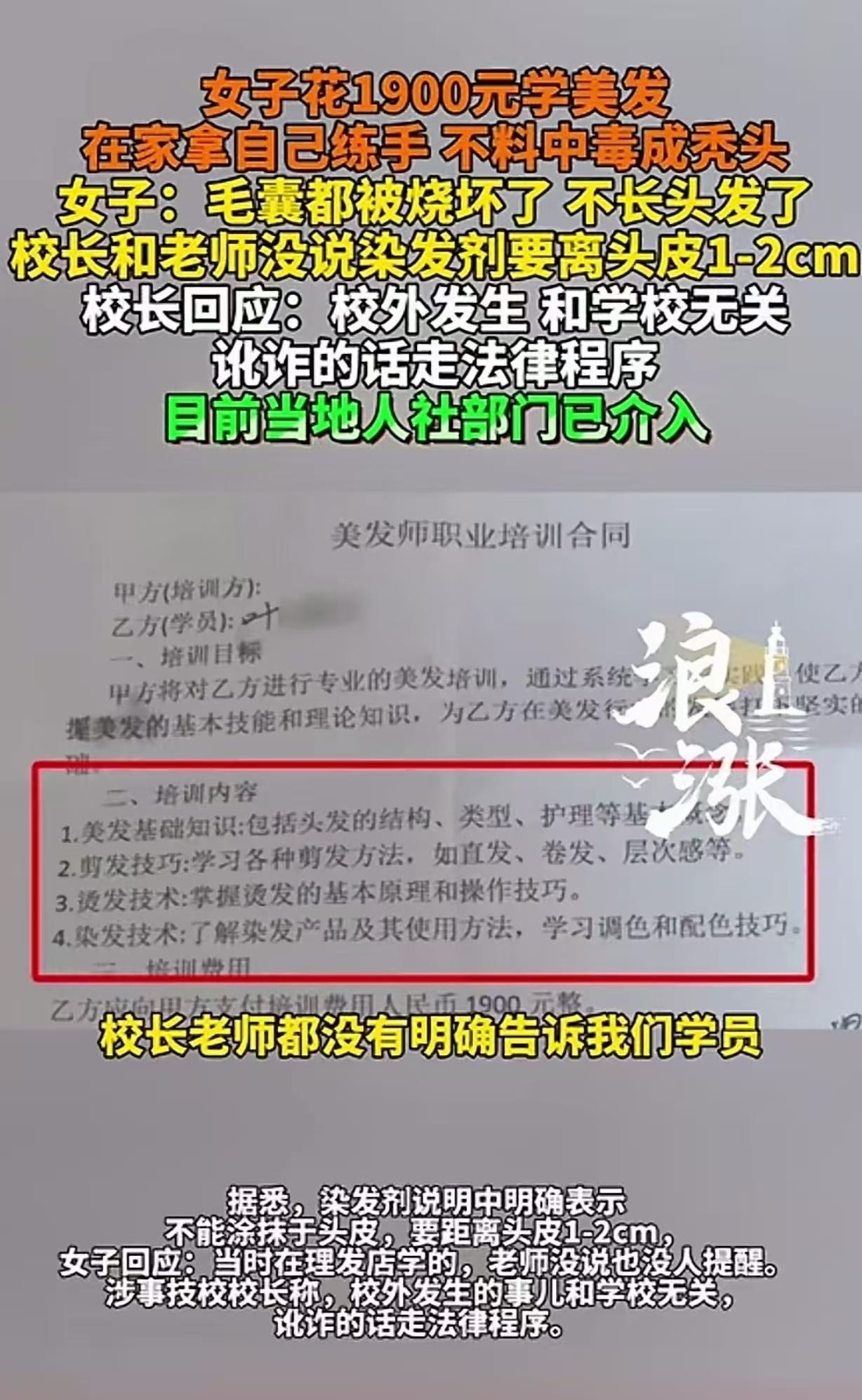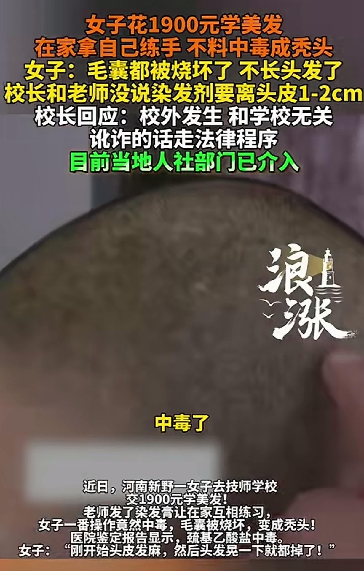 河南新野,一女子花1900元去技校学理发,师傅发了染发膏,让她在家练习,她拿自己练手,一番操作,一开始头皮发麻,然后头发晃了一下,就全都掉了,女子赶紧去医院,竟被告知她中毒了,毛囊被烧坏,变成了秃头,染发剂说明书写着:不能涂抹在头皮上,要距离头皮1-2cm,但师傅没提醒。技校校长:校外发生,和学校无关,讹诈的话随便去告。结局惊呆众人。 一女子,本来想着花1900块钱去技校学个理发的手艺,以后能有个一技之长。 没想到这手艺没学成,头发先没了,还遭了一场大罪。 这女子交了钱后,就等着技校的师傅教她本事。 有一天,师傅发了染发膏,让学员们带回家自己练习。 这女子也没多想,就拿自己当“试验品”,开始练手。 她按照自己理解的方式操作,把染发剂均匀的涂在自己头发上,一开始就感觉头皮有点发麻。 但她也没太在意,以为是正常反应。接着,更可怕的事情发生了,她轻轻晃了一下头发,结果头发大把大把地往下掉,就像秋风扫落叶一样,眨眼间,整个头就秃了。 这女子当时就慌了神,赶紧跑去医院。 医生一检查,告诉她中毒了,是巯基乙酸盐中毒,毛囊被烧坏,头发想再长出来,那可就难了。 原来,那款染发剂的说明书上写得清清楚楚,不能直接涂抹在头皮上,要距离头皮1 - 2厘米,可师傅压根就没提醒过她这回事。 这女子心里那个委屈啊,自己本来是好好来学技术的,结果因为师傅的疏忽,变成了现在这个样子。 这女子找到技校讨说法,没想到技校校长的态度更让人心寒。 校长直接说,这是在校园外发生的事儿,跟学校没关系,要是觉得是讹诈,那就随便去告。 这校长的话,就像一盆冷水,把这女子的心都浇凉了。 东西是学校发的,任务是学校布置的,师傅也是学校派的,现在出了事,学校就想撇得一干二净,哪有这样的道理? 好在相关部门及时介入了调查。这一查,还真查出问题了,原来给这女子培训的老师,根本就没有相关的教学资质。 这就难怪会出现这样的事故了,一个没有资质的老师,能教出什么好学生呢? 相关部门介入后,责令技校为女子办理退费,还要承担她后续的治疗费用。 这女子也算是得到了一点安慰,可她失去的头发,还有遭受的身体和心理上的伤害,又该怎么弥补呢? 这起事件也给其他技校敲响了警钟,办学不能只想着赚钱,得对学生负责,得保证教学质量和安全,不然,迟早会出问题。 有人说,怎么证明老师没有讲,万一是老师讲了自己不注意听呢?都没有老师带着实习,就敢自己实操还怪别人? 这智商还是别学了,但凡学一天都知道,漂粉和染膏离头发一公分。 染发剂里面双氧水成份用高了。或者用了漂白粉。最重要的是停留头皮时间太长了。或者没有洗干净。反正就是操作不当。 《消费者权益保护法》第18条,经营者应当保证其提供的服务符合保障人身、财产安全的要求,对可能危及安全的服务,应当作出真实说明和明确警示。 本案中,技校作为培训服务提供者,不仅未确保老师具备教学资质,还在布置染发练习任务时未提醒安全注意事项,导致学员中毒秃头,已违反法定安全保障义务,应承担退费、赔偿治疗费用及精神损害抚慰金的责任。 对此,你怎么看?