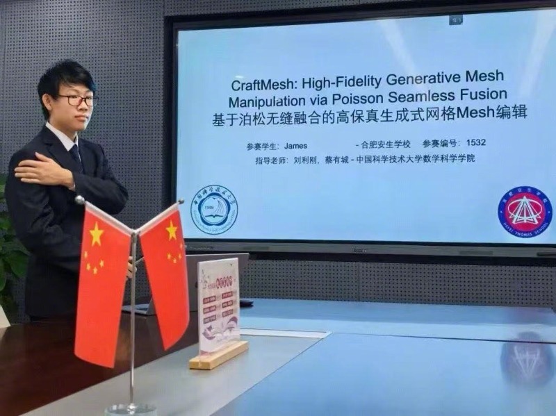 胡同学的论文提出了一种名为CraftMesh的高保真生成式网格模型编辑方法。arXiv上的论文页面显示,该研究将2D图像编辑能力与3D模型生成深度结合,通过泊松几何融合与纹理协调,实现了复杂3D模型的高质量编辑。这项研究也曾助力他荣获第十八届丘成桐中学科学奖(计算机科学)全球唯一银奖 。