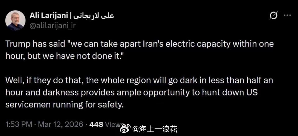 伊朗称若电力遭袭整个地区将陷黑暗拉里贾尼当天在社交媒体上称用波斯文、英文和阿拉伯文发帖说,“美国总统特朗普称‘我可以在一小时内摧毁伊朗的电力系统,但我没这么做’。如果他真这么做了,半小时内整个地区都会陷入黑暗。而黑暗将为追捕那些逃命求生的美军士兵提供良机。”