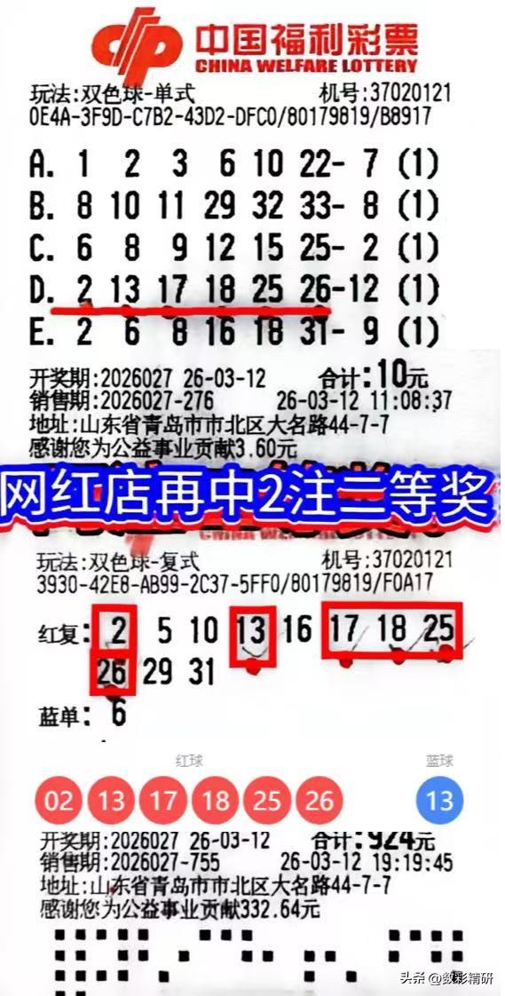 双色球第26027期开奖揭晓,山东青岛这家备受瞩目的彩票站再传捷报!本次站点喜中两注二等奖——一张为5注单式票,揽获奖金30.1万元;另一张为“11+1”复式票,收获奖金30.9万元。 略显遗憾的是,两注号码均与蓝球13擦肩而过,否则该站将一举诞生两注一等奖! 该店位于青岛市北区,历来堪称“福地”,曾多次中出大奖,其中最高奖金达1775万元。附近的街坊不妨前去沾沾喜气,或许下一份幸运,正静候您的光临!