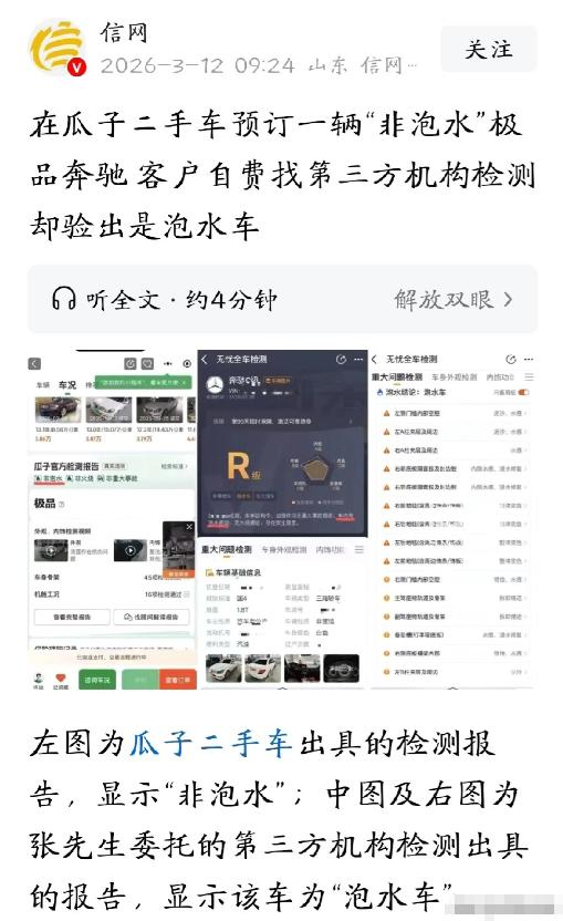 妥妥的诈骗!山东德州,男子在某二手车平台看了一辆13款的奔驰C260,标价4.35万,官方检测报告上写着“非泡水、非火烧、非重大事故”,他觉得性价比挺高,马上付了1000元定金。为了保险,他又花599元找了第三方机构进行检测,发现这车竟然是辆泡水车。事后,平台承认,复检结果确实是泡水车,但鉴定日期却是自己发现之前。男子怒了,他怀疑平台明知车子有问题,还要卖给他,纯属诈骗,要求赔偿。 约定检测的那天,平台工作人员还特意把车送到了第三方检测点,全程陪同,看着倒是挺正规。可检测结果一出来,他当场就懵了——第三方机构明确告知。 这辆车是妥妥的泡水车,还出具了详细的检测报告,上面标注着多处泡水痕迹,比如座椅轨道有锈蚀、地毯下方有泥沙残留,这些都是泡水车无法掩盖的铁证。 得知消息后,平台工作人员也没多说,当场就把车运回了平台,说要进行复检。他心里又气又急,一边等着平台的说法,一边琢磨着这事不对劲——平台自己的检测说不是泡水车,第三方一查就露馅了,难不成平台早就知道内情? 等到他主动联系平台询问复检结果时,已经是几天后了。平台终于松口,承认复检结果确实是泡水车,还出具了一份车况鉴定证书,注明这辆车“未通过平台车况认证”。可当他看到证书上的鉴定日期时,彻底怒了——那份复检报告的出具日期,竟然在他找第三方检测之前。 这就意味着,平台早就知道这辆车是泡水车,却故意隐瞒不说,还拿着“非泡水”的虚假检测报告误导他付定金,这不是明摆着诈骗吗?他当即找到平台,要求对方赔偿自己的损失,包括599元的检测费、来回的交通费,还有精神损失费。 一开始,平台的处理态度特别敷衍,只愿意退还他1000元定金,再补偿一张200元的购车优惠券,还限定30天内必须使用。这样的处理方式,换谁都不能接受。 他反复和平台沟通,据理力争,说自己之所以花额外的钱找第三方检测,就是因为信任平台的承诺,现在平台涉嫌欺诈,不能就这么轻描淡写地了事。 经过多次协商,平台最终才松口,赔偿了他1000元,涵盖了检测费和交通费,双方算是达成了和解。可这事并没有就这么结束,他心里的疙瘩一直没解开,很多网友得知后也纷纷议论,觉得平台这不是失误,而是故意为之。 其实仔细想想,这事背后藏着的问题,远比我们看到的更严重。现在二手车市场水有多深,相信买过二手车的人都有体会,“调表车”“泡水车”“事故车”伪装成正常车售卖的情况,并不少见。 而这次事件中,最让人愤怒的不是车辆本身有问题,而是平台作为专业的交易中介,竟然出具虚假检测报告,明知车辆有问题还继续售卖,把消费者的信任当儿戏。 有人可能会说,是这位男子太谨慎,多花了599元冤枉钱,可恰恰是这份谨慎,让他避免了更大的损失。 要知道,泡水车的隐患极大,电路系统容易短路,行驶过程中可能会突然熄火、失灵,严重的还会引发自燃,危及生命安全。如果他没有找第三方检测,直接付了尾款提车,后续不仅要花大笔钱维修,还可能面临生命危险。 更值得一提的是,根据《消费者权益保护法》第五十五条规定,经营者提供商品或者服务有欺诈行为的,应当按照消费者的要求增加赔偿其受到的损失,增加赔偿的金额为消费者购买商品价款的三倍。 也就是说,要是能认定平台存在欺诈行为,这位男子完全可以要求平台退一赔三,而不仅仅是赔偿检测费和交通费。 对比之前东莞、重庆等地的类似案例,有的消费者买到泡水车后,通过法律途径维权,最终获得了三倍车款的赔偿。而这次事件中,平台仅赔偿1000元就了事,难免让人觉得处罚太轻,也难以起到警示作用。毕竟,要是欺诈的成本这么低,只会有更多平台铤而走险,继续欺骗消费者。 这事也给所有想买二手车的人提了个醒,不要被所谓的“高性价比”冲昏头脑,也不要完全信任平台的检测报告。哪怕平台拍着胸脯保证车况没问题,自己也要多留个心眼,最好找第三方检测机构做一次全面检测,花几百块钱买个安心,总比后续花几万块维修、甚至面临安全隐患要强。 二手车平台的核心竞争力,本该是靠谱的车况和诚信的服务。可现在有些平台,为了赚取佣金,不惜隐瞒车辆隐患、出具虚假报告,看似短期赚了钱,实则砸了自己的口碑,也破坏了整个二手车市场的秩序。消费者的信任一旦被消耗,想要再赢回来就难了。 面对二手车平台的虚假检测,消费者除了自行检测、反复维权,还有更好的办法吗?平台的检测流程该如何规范,才能避免类似的欺诈事件再次发生?希望这件事能给所有二手车平台敲响警钟,也希望相关部门能加强监管,让消费者买二手车时,能真正放心、安心。