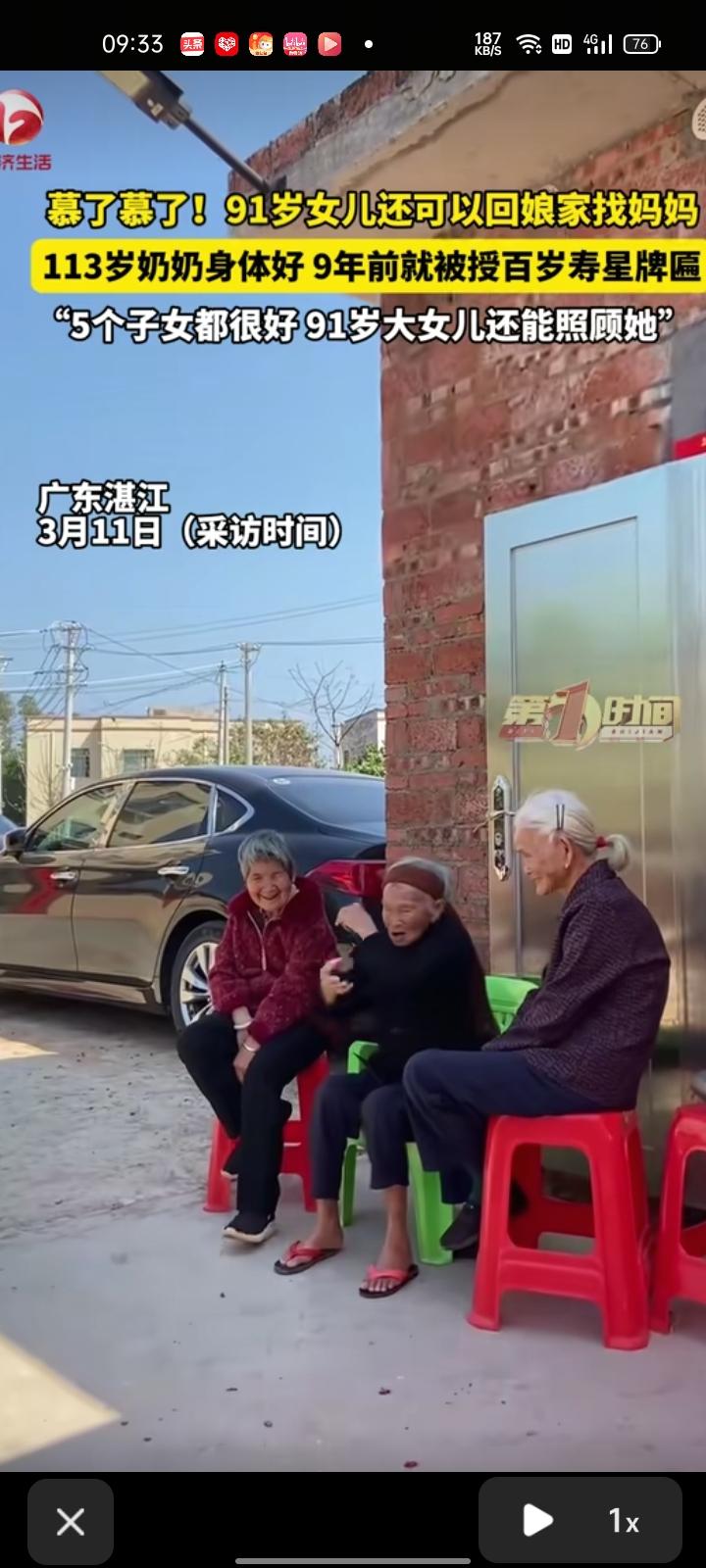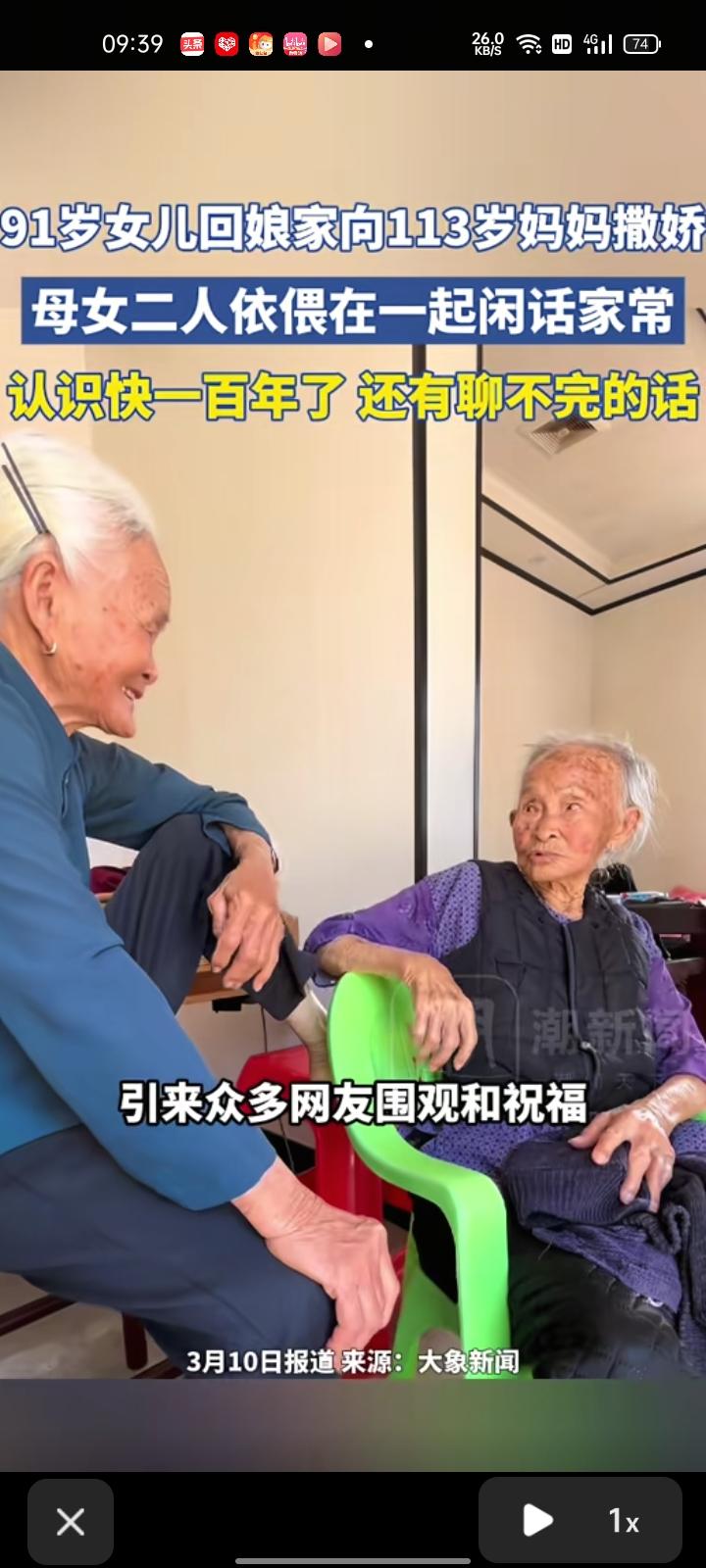 3月11日,广东湛江。91岁女儿回娘家,向113岁母亲撒娇,引来不少网友围观和祝福,“羡慕”两个字写在脸上了。据了解,每次女儿回家,母亲舍不得女儿离开,总说再坐一会说说话。母女俩常常坐在一起唠家常,这就是最大的幸福,不管多大年纪在父母眼里永远是个孩子
