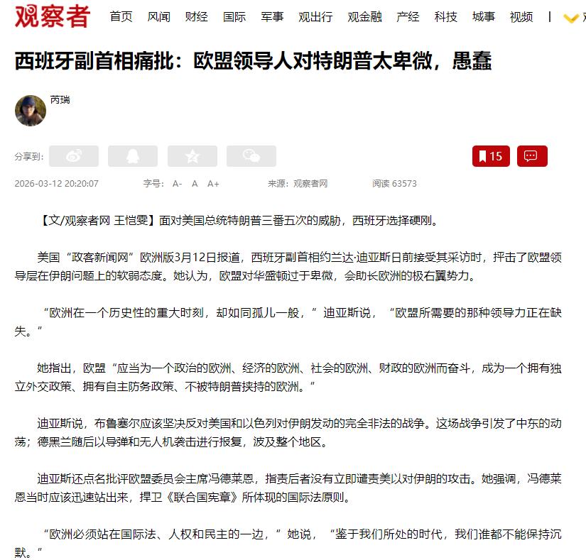 欧盟真是太愚蠢了! 最近,西班牙副首相约兰达·迪亚斯说的一番话,在欧洲吵翻了天。3月12日,她接受美国“政客新闻网”欧洲版采访时,毫不客气地骂欧盟领导层,说他们面对美国总统特朗普的威胁,表现得太没骨气、太愚蠢,尤其是在伊朗问题上,一味软着来、不敢反抗,根本没起到领导作用。 大家肯定会问,特朗普到底对欧洲、对西班牙做了啥,让副首相这么生气? 其实特朗普上台后,就没停止过威胁欧盟,总拿贸易、军事基地说事,而欧盟的领导人们,大多时候都忍气吞声,不敢反抗,这才让迪亚斯忍不住站出来说话。 最直接的原因,就是最近美国要打伊朗,想借西班牙南部的两个军事基地——莫龙空军基地和罗塔海军基地。 这两个基地是美国在西班牙唯一的常设军事设施,位置很重要,离中东很近,美军从这出发,能更快赶到中东打仗。 按照西班牙和美国的约定,这两个基地的主权是西班牙的,美军要用来打仗,必须先经过西班牙政府同意。 面对美国的要求,西班牙直接拒绝了。这下特朗普就恼了,3月3日在白宫见德国总理时,公开骂西班牙态度不好,是个糟糕的盟友,还威胁说要切断和西班牙的所有贸易,再也不跟西班牙来往。 另外,特朗普还不满西班牙的军费没达到他要求的标准,一直拿这事找西班牙的麻烦。 这也不是特朗普第一次威胁欧洲国家了,之前他就因为想买格陵兰岛被拒,扬言要给好几个欧洲国家加关税,吓得欧洲各国都不敢吭声。 可就算特朗普一次次施压,欧盟领导层还是一味妥协,不敢跟他硬刚。 为啥欧盟就这么软,不敢跟特朗普硬刚呢?说白了就三点:一是很多欧洲国家军事上离不开美国,觉得没美国保护就不安全,不敢得罪美国。 二是欧洲和美国生意往来多,怕特朗普真的切断贸易、加征关税,影响自己国家的经济。 三是欧盟内部意见不统一,有人帮美国说话,有人反对,吵来吵去,根本没法一起硬气起来,最后只能妥协。 和欧盟不一样,西班牙这次选择硬刚到底。面对特朗普切断贸易的威胁,西班牙政府直接回应,说美国必须尊重和欧盟的约定,要是想改变贸易关系,就得守规矩。 迪亚斯也明确表示,特朗普的威胁不能接受,西班牙不会被外人施压,美国再也不能对西班牙指手画脚了。 西班牙敢硬刚,不是脑子一热,是有底气的。一是西班牙政府本来就不认同美国的霸道做法,国内老百姓也支持拒绝美国。 二是美国借基地打仗不合规矩,西班牙拒绝是维护自己的主权,占着理。 三是西班牙是欧盟成员国,有欧盟当后盾,美国真要制裁,面对的是整个欧盟,根本没用。 现在,欧洲不少国家也开始醒悟,法国、英国等都不认同美国打伊朗的做法,意大利还爆发了抗议。 迪亚斯的批评,就是想让欧盟醒悟,团结起来,不再看美国脸色,自己做主。 这件事也告诉我们,不管是国家还是个人,面对不合理的威胁,一味退让只会被欺负,只有敢说不,才能守住自己的底线,赢得尊重。西班牙的硬刚,值得点赞。